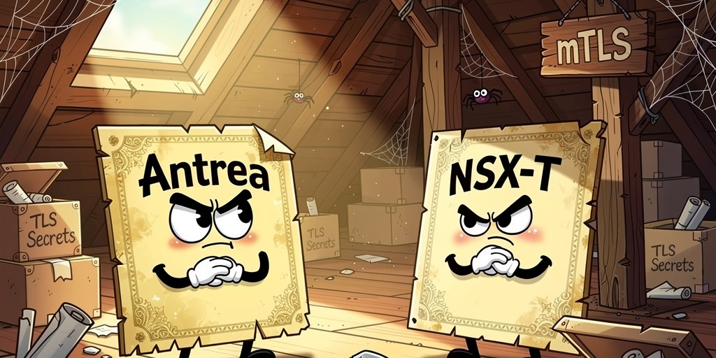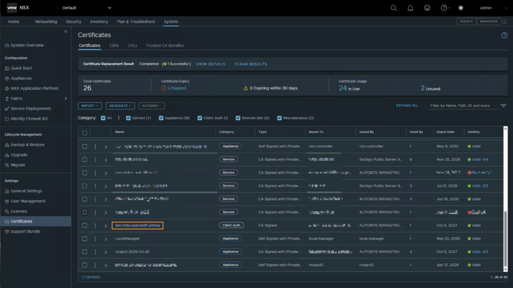 Comme le diable se cache dans les détails, la modification du certificat client attendu par NSX pour cette connexion ne peut se faire que grâce à un appel API. Du côté d’OpenShift, c’était « plus simple » dans le sens où il suffisait de modifier les secrets présents dans le CNI Antrea. L’erreur de départ se matérialisait par un message dans le conteneur tn-proxy : « tlsv1 alert unknown ca ».