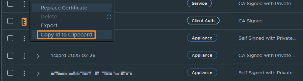 L’ID de certificat se trouve directement dans l’interface, dans la partie de gestion des certificats de NSX-T :