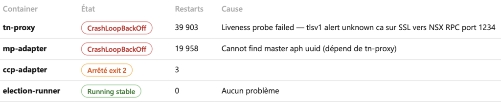 En creusant (je vous simplifie la chose, car l’investigation dure depuis plus de quatre mois désormais…), nous nous sommes aperçus que c’était la communication mTLS entre le CNI et le manager NSX-T qui ne se faisait plus : le certificat avait expiré et il était impossible de réintégrer en l’état l’autorité racine de certification qui avait servi à valider celui-ci… Nou’v’la bien, comme dit l’autre !