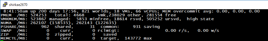 Afin de regarder un peu comment ça se passe au sein de nos chers ESXi, il est possible d’utiliser esxtop pour visualiser les statistiques de localisation des VM par rapport à leurs processeurs d’élection. Pour se faire, il faut jouer de la ligne de commande, bien sûr. Connectez vous sur un de vos ESXi en ssh, puis lancez la commande en question.