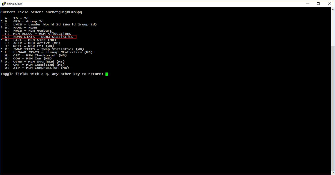 Ici, nous sommes sur un serveur bi-processeur disposant donc de deux banques mémoire (une par proc). Dans ces conditions, sur la ligne « NUMA », vous trouvez la taille de chaque banque mémoire avec entre parenthèses l’espace disponible. Ensuite, pour avoir des statistiques spécifiques à chaque VM, il vous faut customiser un peu la vue du dessous. Tout d’abord, histoire de se consentrer, appuyez sur la touche « V » (majuscule) pour ne visionner que les process « VM » dans la liste. Ensuite, appuyez sur la touche « f » puis sélectionnez, en appuyant sur « g », les statistiques NUMA :