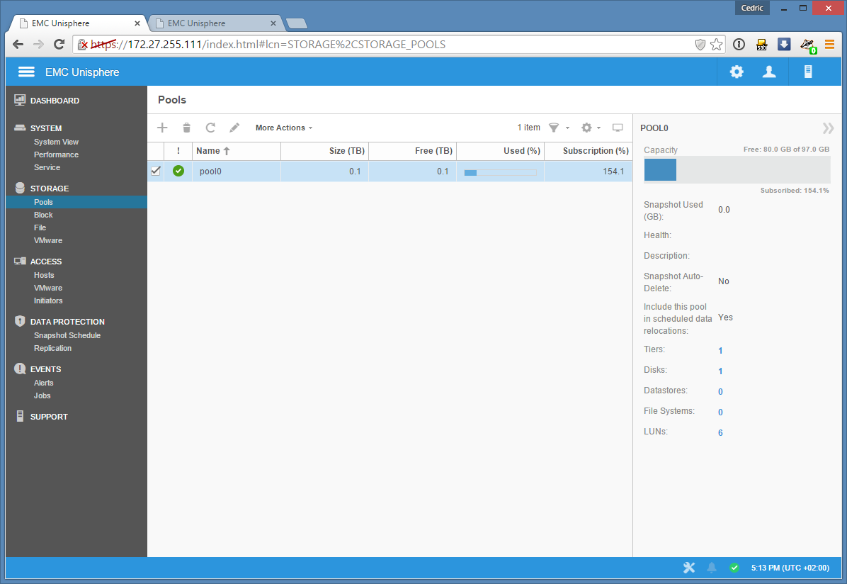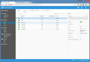 L’installation des vVNX ne pose pas de problème particulier. Une fois les licences installées, j’ai rajouté une règle DRS pour forcer les machines vVNX1 pour DC1 et vVNX2 pour DC2 à tourner sur les serveurs ESXi correspondant à leur hébergement nomminal. Enfin, on provisionne quelques centaines de giga de chaque coté pour pouvoir travailler ensuite et mettre à disposition les divers LUNs.