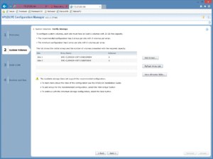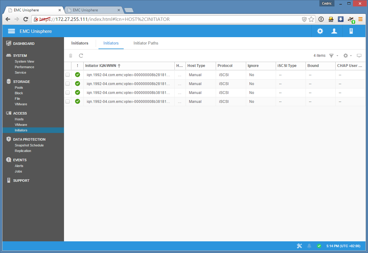 La première étape consiste à monter les vVNX de chaque datacenter DC1 et DC2 (référez-vous au schéma que je vous ai présenté dans le premier billet). Histoire d’avoir les meilleurs version de code du projet liberty d’EMC, j’ai découvert une « astuce » : vous pouvez noter sur cette page (la page magique de tous les téléchargements EMC disponibles en trial/free-to-use) qu’il existe deux versions différentes de vVNX : une « classique » en version 3.1.2 proposant les fonctions block/file de la solution et une très récente en 3.1.4 (avec une interface renouvellée) disposant des APIs et code nécessaire pour évaluer vVOL (je vous proposerai un article spécifique à ce sujet bientôt). Ensuite, vous devez entrer un fichier de license correspondant, normalement, à la version que vous souhaitez évaluer. En fait, il se trouve que vous pouvez tout à fait générer un fichier de licence pour vVNX 3.1.2 et l’utiliser dans la 3.1.4. Ce faisant, vous récupérez un code plus récent pour des fonctions block/file. Bon évidemment, pour ce que nous allons exploiter ici (block mode en iSCSI), ça ne changera pas grand chose, mais bon… c’est mon coté geek 😉
