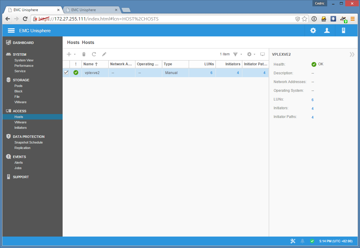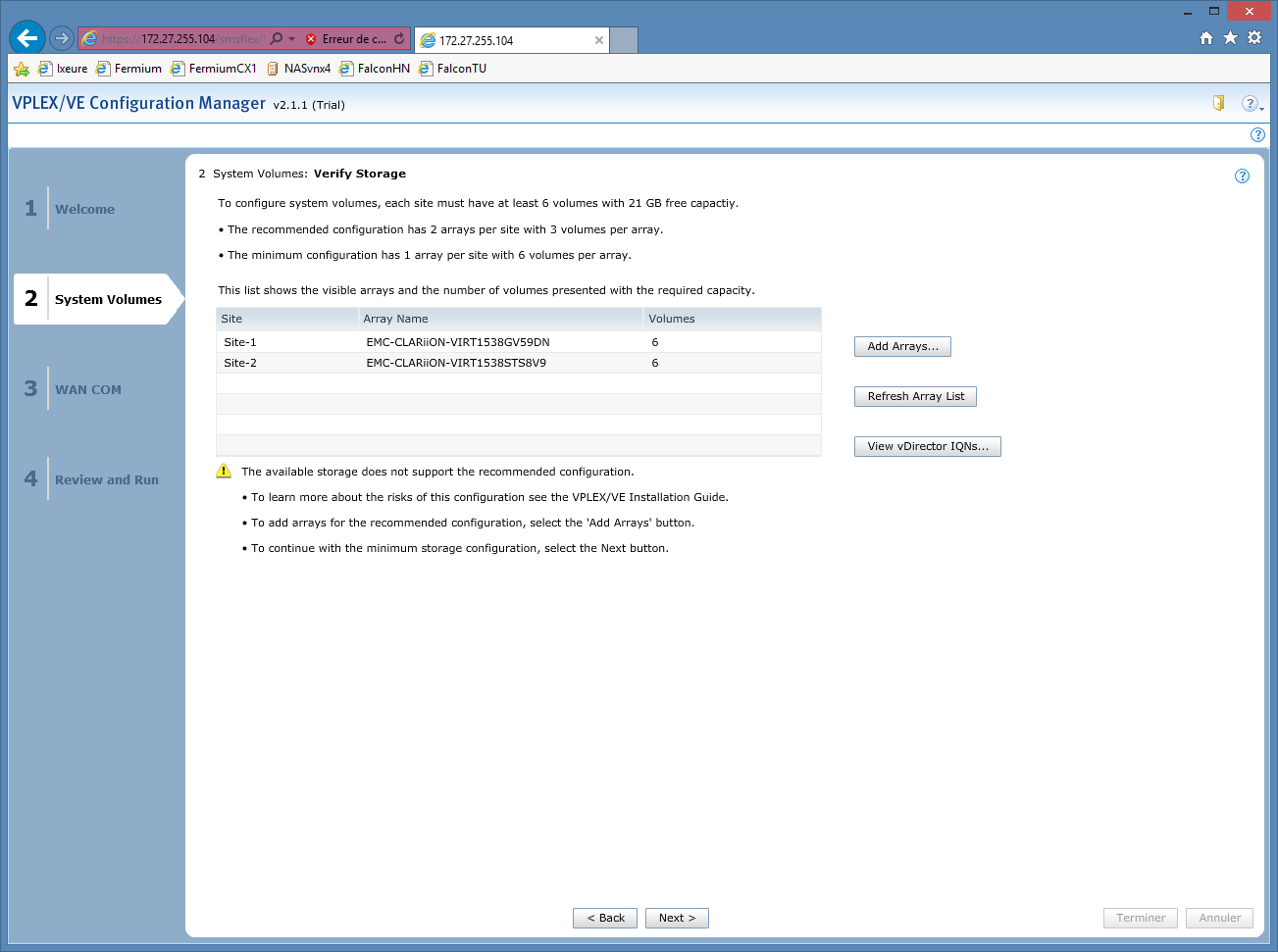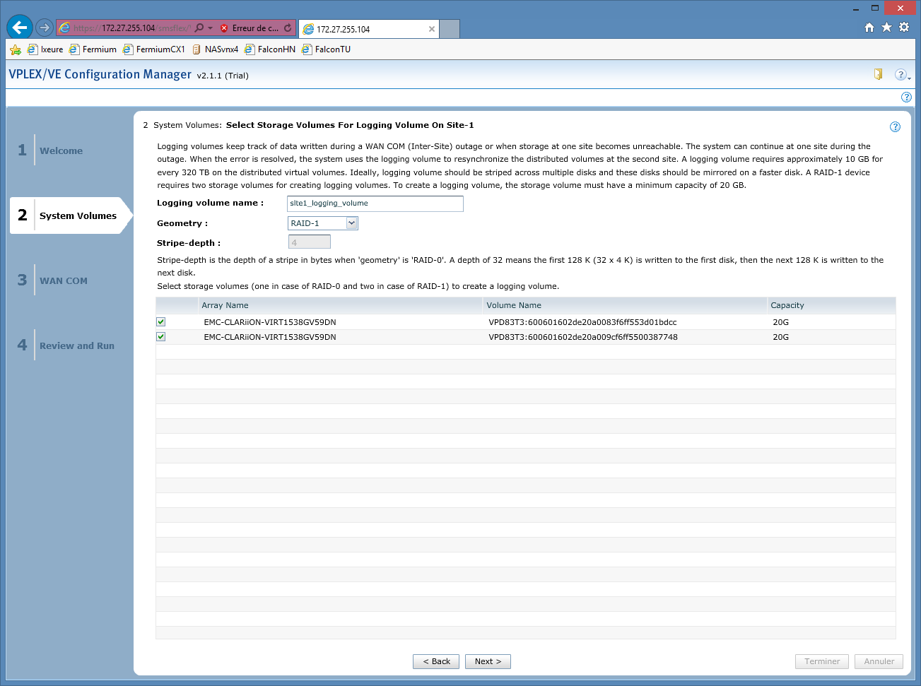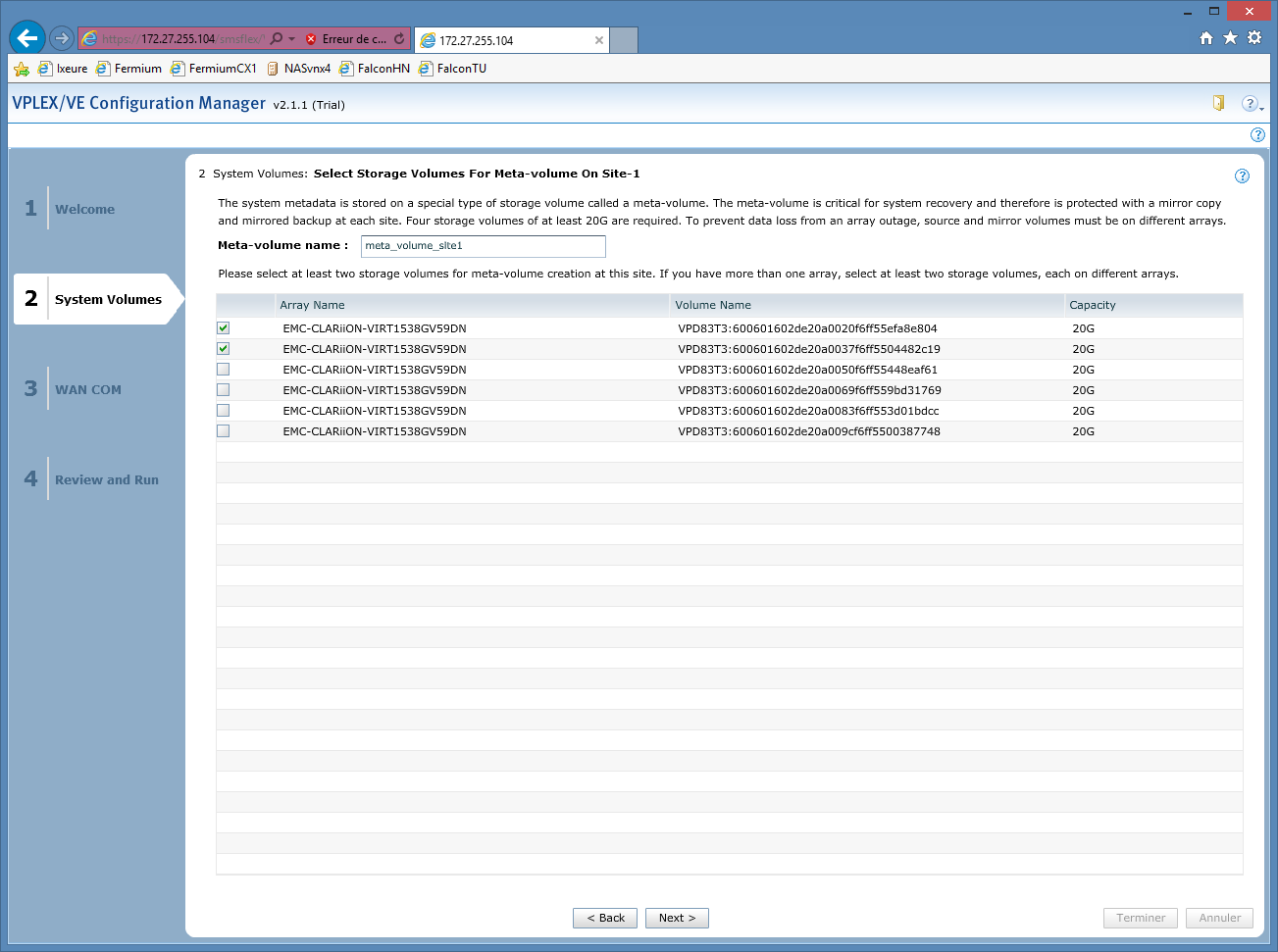 Après la création d’un total de 6 LUNs par vVNX pour le fonctionnement de base des deux clusters VPlex, nous sommes donc parés pour rajouter la couche VPlex/VE par dessus. Je ne vais pas détailler le process, assez lourd, d’implantation de VPlex car je l’ai déjà largement présenté dans les billets dédiés évoqués plus haut, mais comme initialement, les deux solutions vVNX et VPlex/VE se sont très bien accordées l’une avec l’autre et du premier coup !
