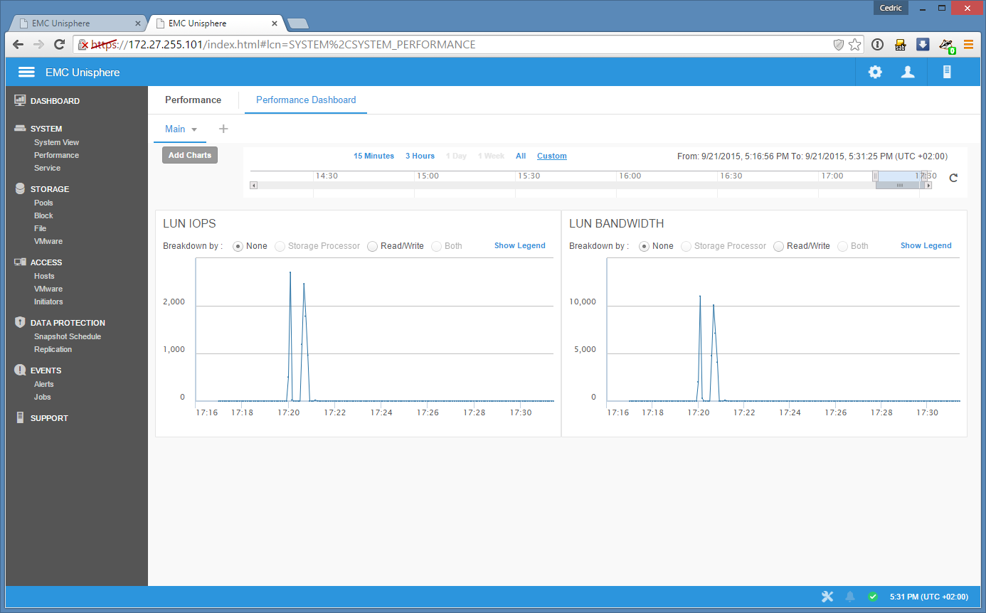 J’ai noté aussi pendant certaines phases de lecture intensive que, curieusement, les vVNX n’étaient quasiment pas sollicitées. En fait, je pense que le cache des directeurs VPlex étaient à l’oeuvre derrière ce mystère apparent ! Malheureusement, VPlex/VE étant amputé des fonctions intégrées de supervision et monitoring de son grand frère, je n’ai pas pu le vérifier.