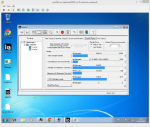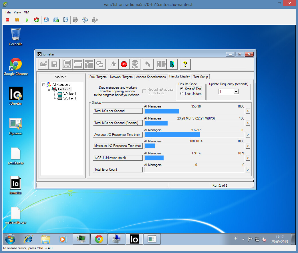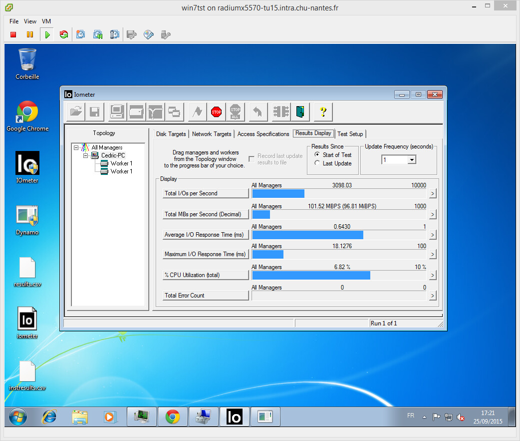 Ensuite, J’ai procédé à des tests via l’indécrotable IOmeter, lancé sur une banale petite VM Windows 7 bi-vCPU hébergée sur un datastore fourni par VPlex/VE. La encore, on obtient globalement des bon résultats. Voici deux tests particuliers : le premièr est constitué d’un pattern de 100% de lectures dont 50% sont aléatoires, on dépasse les 3000 IOps et un taux de transfert moyen de plus de 100 Mo/s ; le second est un full write avec 50% d’aléatoire et toujours des blocs de 64k, on tombe à 300 IOps, à un peu plus de 20 Mo/s. Même si ce n’est encore une fois qu’un petit essai, cela donne une idée du potentiel « production » des solutions employées.