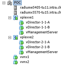 Au final, on obtient un VPlex/VE en configuration Metro, dont chaque cluster (deux directeurs par cluster) s’appuie sur une vVNX pour obtenir du stockage. Les deux ESXi sont connectés chacun à leur engine via iSCSI.