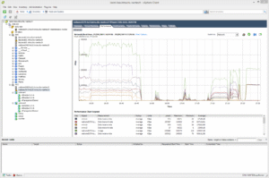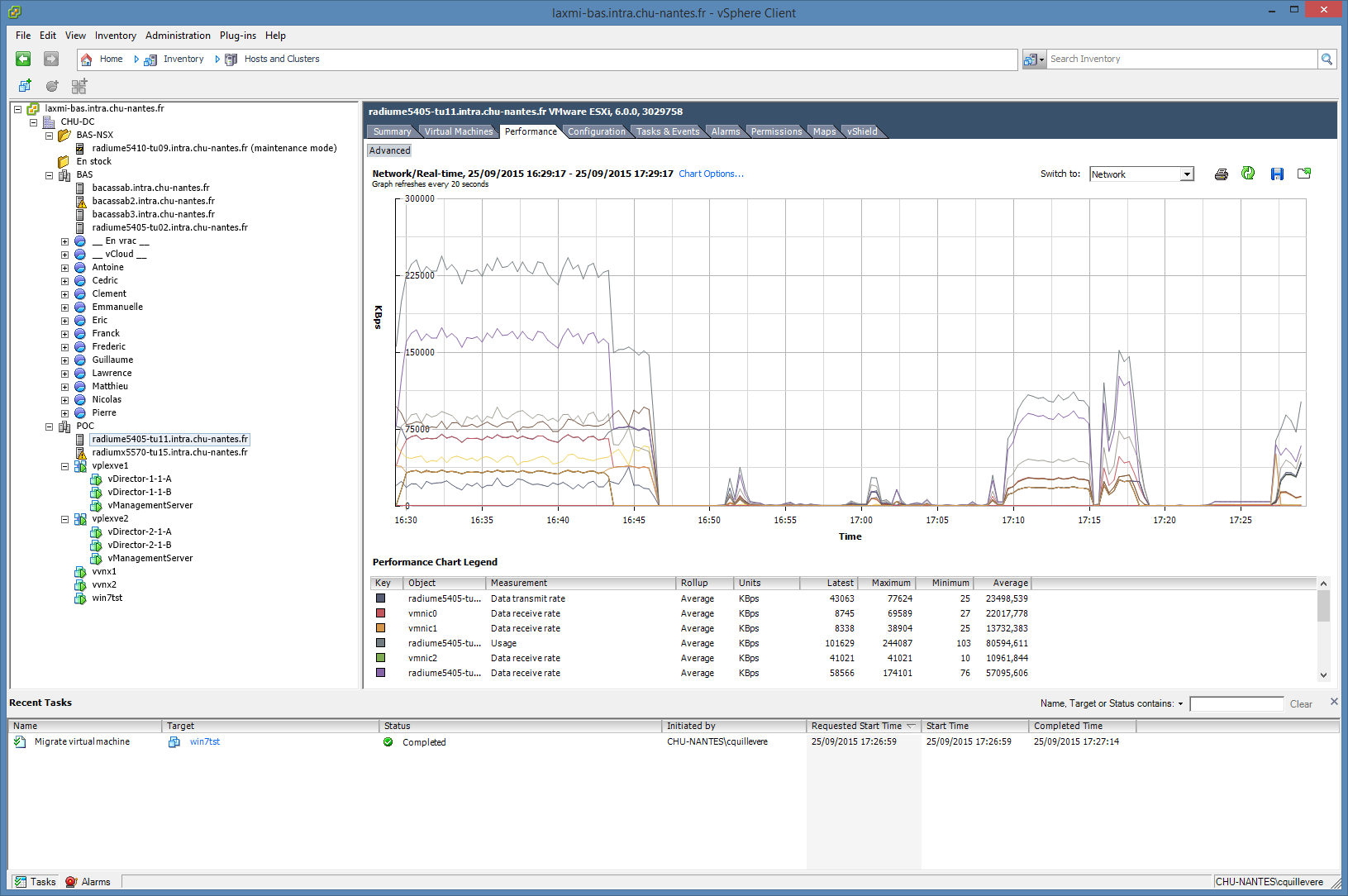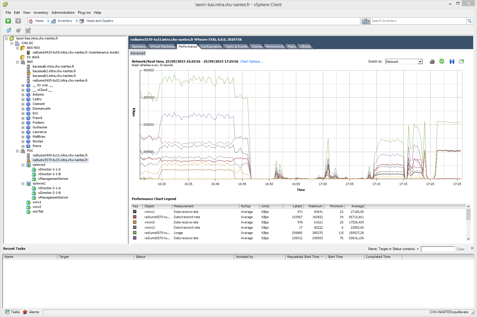 Ce qui est aussi intéressant, c’est de constater le comportement des ESXi pendant ces phases de test. On remarque en particulier des paliers sur les IO réseau : en fait, des paliers très très plats, souvent synonymes de saturation « physique ». Et le fait est que c’est souvent le cas… gigabit oblige 😉 . De même, pendant ces tests, un petit vMotion a permit de voir les IO passer d’un ESXi à l’autre… c’est logique, prévisible, mais depuis que je fais du VMWare, cette techno m’a toujours autant bluffé !