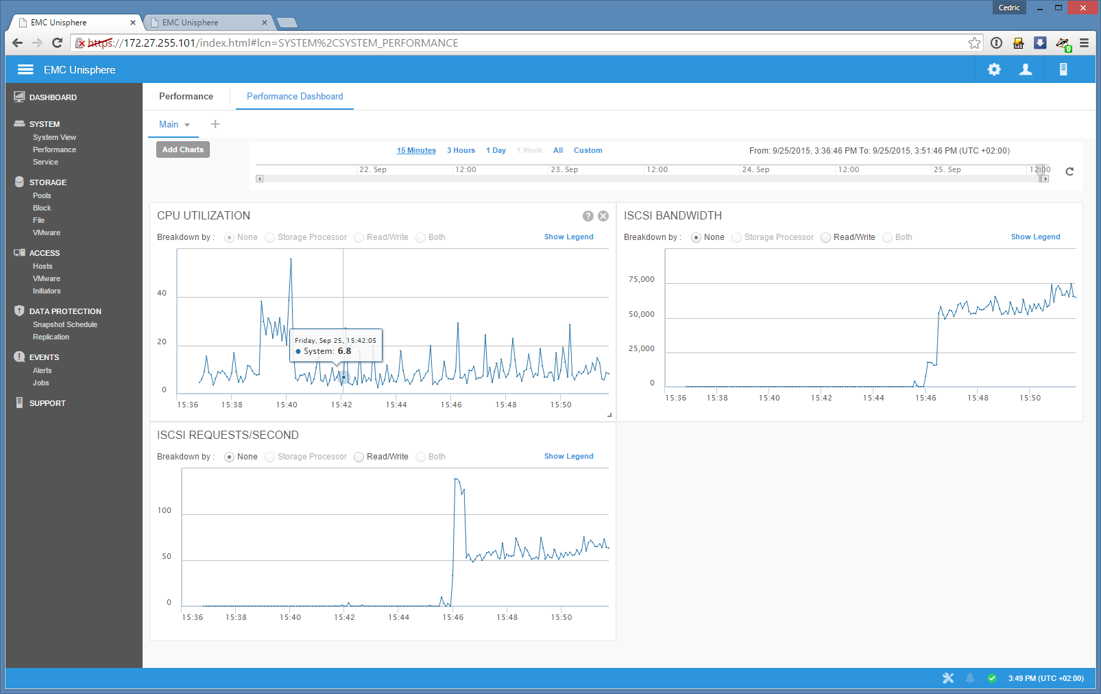Ce qui est notable ici c’est l’utilisation CPU (2 vCPU par VNX), elle reste très raisonnable, augurant le meilleur si j’avais eu du 10 Gbit à dispo sur le vLab 🙂