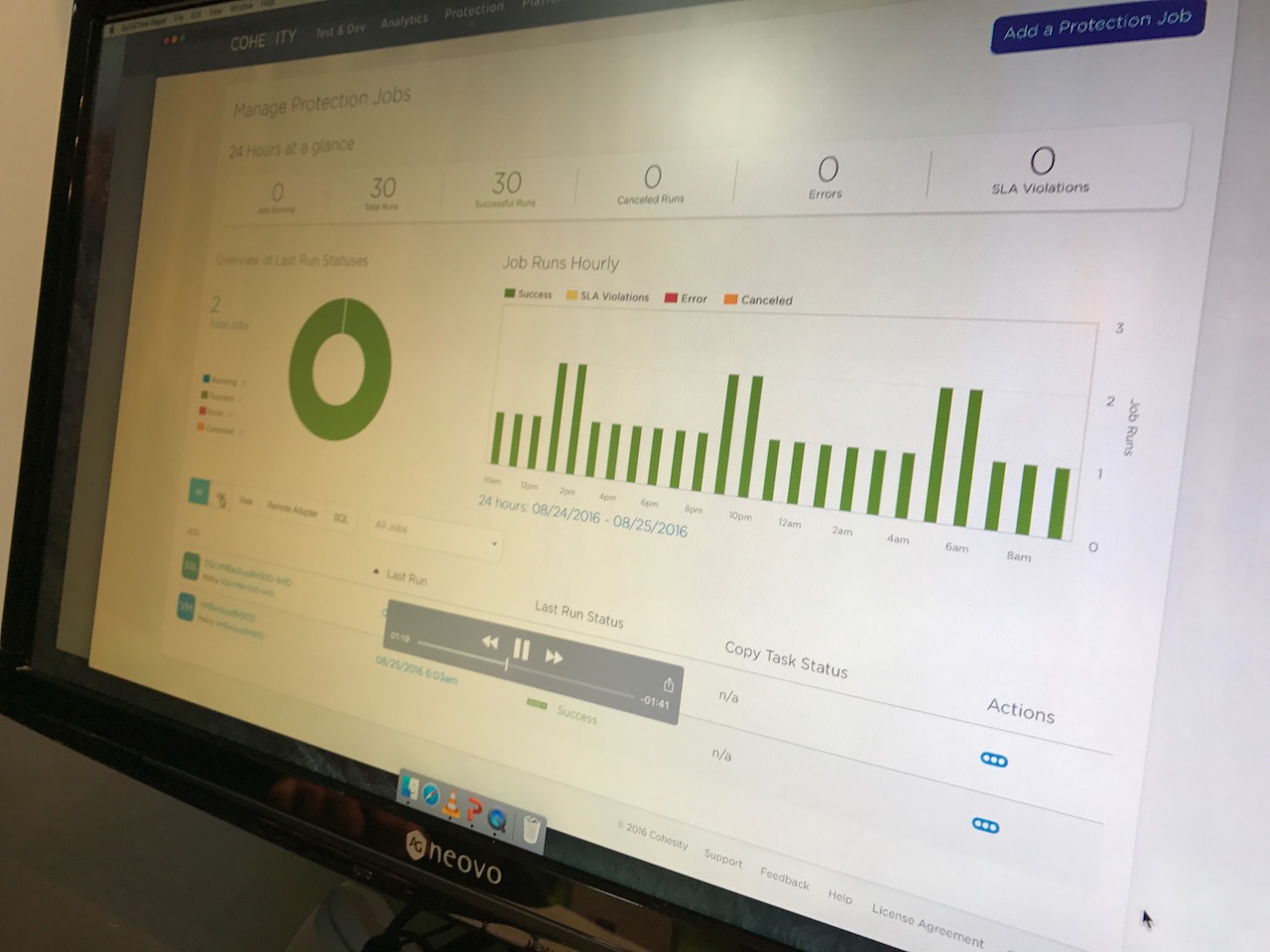 Coté logiciel, on trouve donc une solution intégrée et autonome qui offre avant tout des fonctions de backups, son coeur de métier. Compression et déduplication à la source sont de la partie, bien entendu, avec des agents application-aware pour Oracle, SQL Server, Sharepoint, Exchange. Le principe qui prévaut au coeur du moteur de Cohesity est la notion de snapshot : toutes sauvegardes réalisées sont systématiquement identifiées par des instantanés des objets qu’elles protègent : typiquement, une VM, un host physique ou un fichier dans le cas d’un backup de filer. De plus, on associe à chaque objet ou groupe d’objet à protéger un SLA formel indiquant la rétention, le RPO souhaité, voir l’externalisation vers certains cloud publics (aujourd’hui Google, Azure et AWS sont pris en charge).