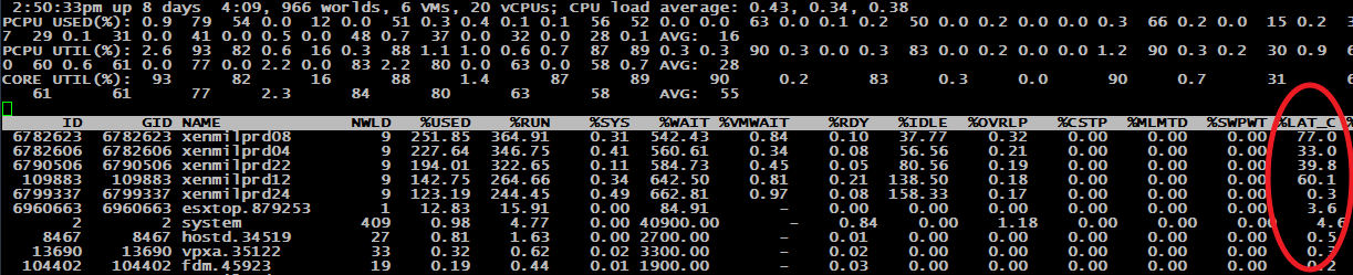 Après quelques recherches sur le Net, je suis tombé sur plusieurs fils de discussion, notamment sur les communautés VMware (voir par exemple ici), qui parlaient précisément de ce problème et pointaient du doigt une autre valeur, non affichée par défaut : %LAT_C. Bizarrement, la définition de VMware est très proche, voir équivalente à %RDY … en tout cas en première approximation : LAT_C, ou Latency_CPU, est le pourcentage de temps pendant lequel le processus ou la VM attend l’accès au CPU mais ne l’obtient pas pour cause de contention… bien avancé, du coup, le gars … Certains constataient donc que ce %LAT_C était extrêmement élevé (il est accessible via esxtop en ajoutant l’option « I = SUMMARY STATS » à la vue CPU). Et force est de constater que c’était aussi le cas chez nous :