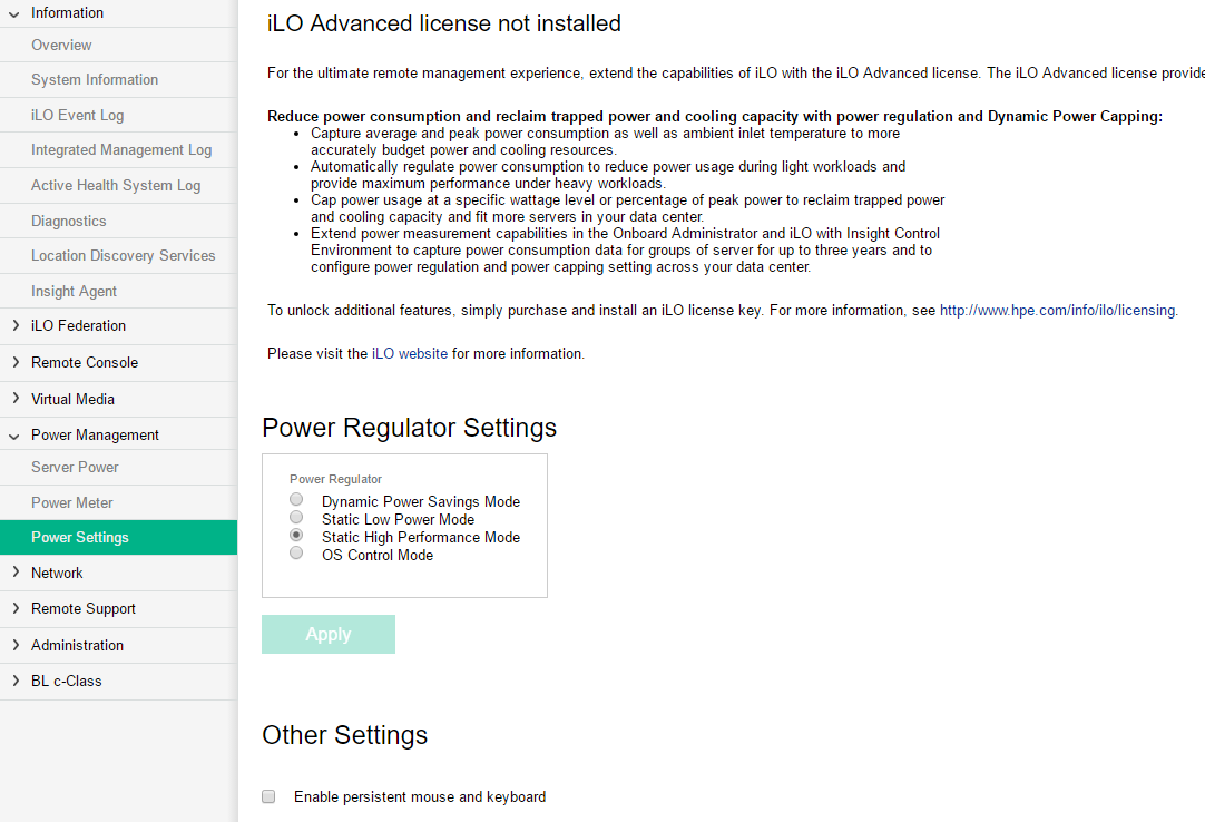 Visiblement, ce %LAT_C abracadabrantesque est souvent du au choix du mode de gestion de l’énergie des CPUs mis en oeuvre sur la machine ! Lorsque vous êtes en mode « dynamique » cet indicateur s’envole très régulièrement, sans doute à cause d’une gestion dynamique des fréquences de fonctionnement des CPUs et non directement maîtrisée par ESXi. En l’occurrence, en modifiant ce paramétrage dans le BIOS de la machine (ce qui, sur nos HP, se fait directement dans iLO et est pris en compte sans reboot), dans la seconde qui a suivi, le %LAT_C est retombé quasiment à zéro, éliminant du même coup les niveaux de contentions constatés sur vROps :