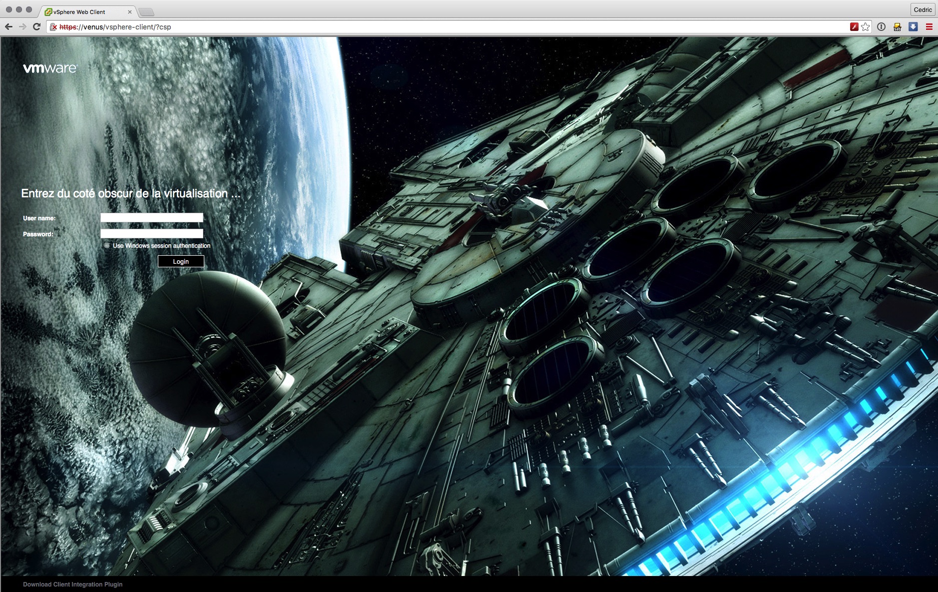 Allez, on a beau être Lundi, il faut aussi savoir ne pas se prendre au sérieux.. Via un tweet de Scott Bollinger, je viens de découvrir une bidouille pour customiser son accueil vCenter 6. La manipulation en question est détaillée sur Virtually Ghetto et relativement simple pour qui sait manipuler quelques fichiers DHTML/CSS/Javascript. Il va sans dire que comme ce n’est pas officiel, c’est donc totalement non supporté. Donc, faites un petit backup des fichiers originaux quand même avant de vous amuser…