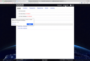 Je suis parti de mon instance Nakivo v6 déjà complètement paramétrée et exécutant depuis plusieurs semaines des sauvegardes journalières de certaines VMs vers un repository CIFS (sur mon NAS Synology).