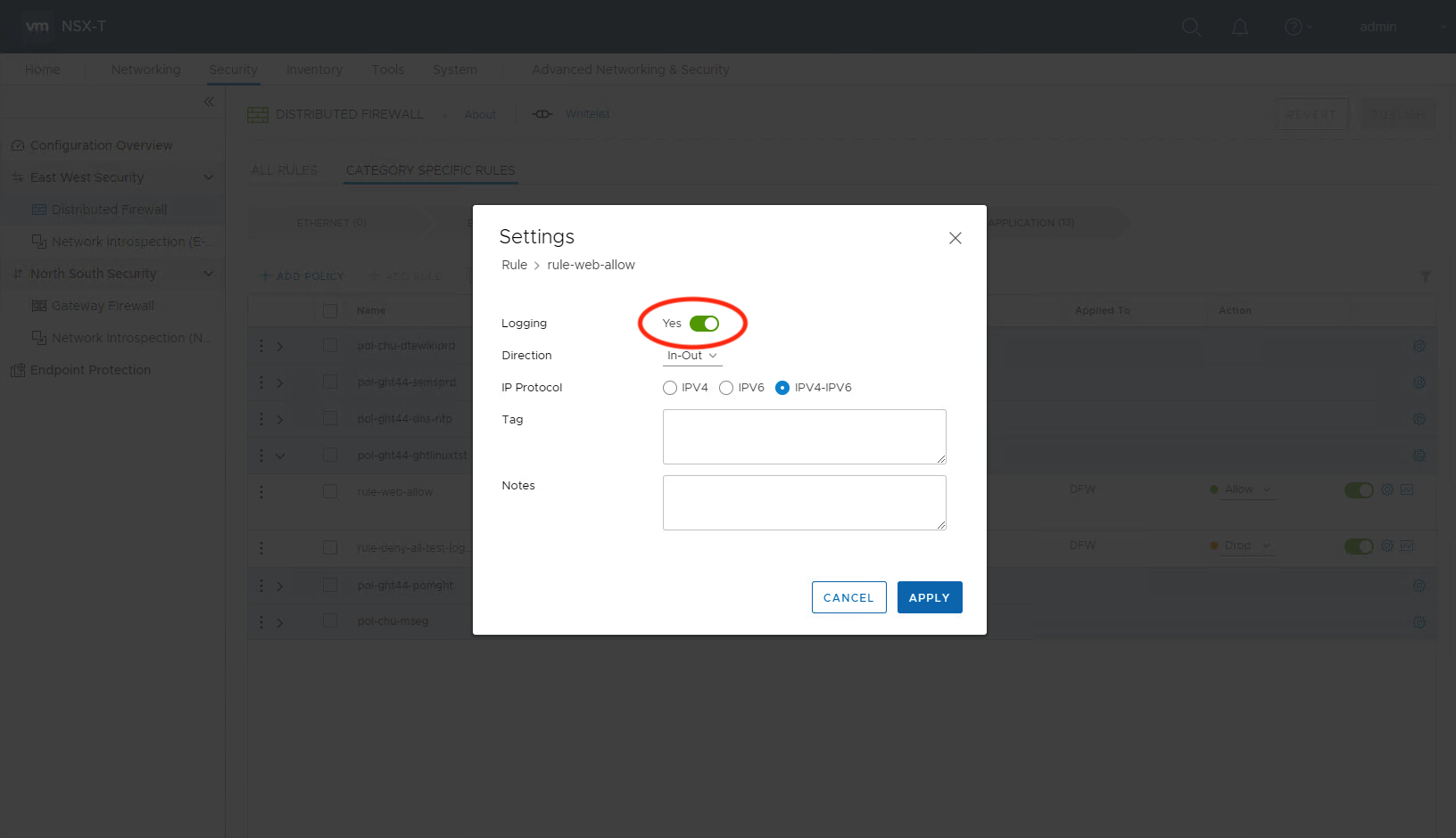 Le préalable à ce debugging consiste à activer le logging sur les règles firewall que vous souhaitez checker. pour ce faire, il faut aller dans l’interface NSX-T, onglet « Security », vous placer sur la règle en question et enfin commuter le paramètre « log » logging sur « Yes » :