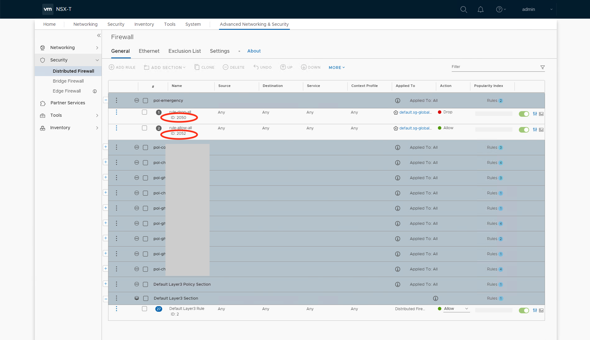 L’id de la règle matchée apparait juste après le « match PASS » ou le « TERM ». Dans l’exemple, on discerne la 7202 et la 7193. Vous remarquerez au passage que ce format de log est relativement standard, il est facile de l’injecter dans une suite type Elastic/Logstash/Kibana par exemple (si vous ne voulez pas utiliser Log Insight). Pour retrouver le nom de votre règle, il faut aller dans la section « Advanced Networking & Security->Security->Distributed Firewall » et déployer vos règles, Vous aurez accès à leur ID. Malheureusement, jusqu’à la 2.4.1, a ma connaissance, l’ID n’est visible qu’à cet endroit dans l’interface graphique :