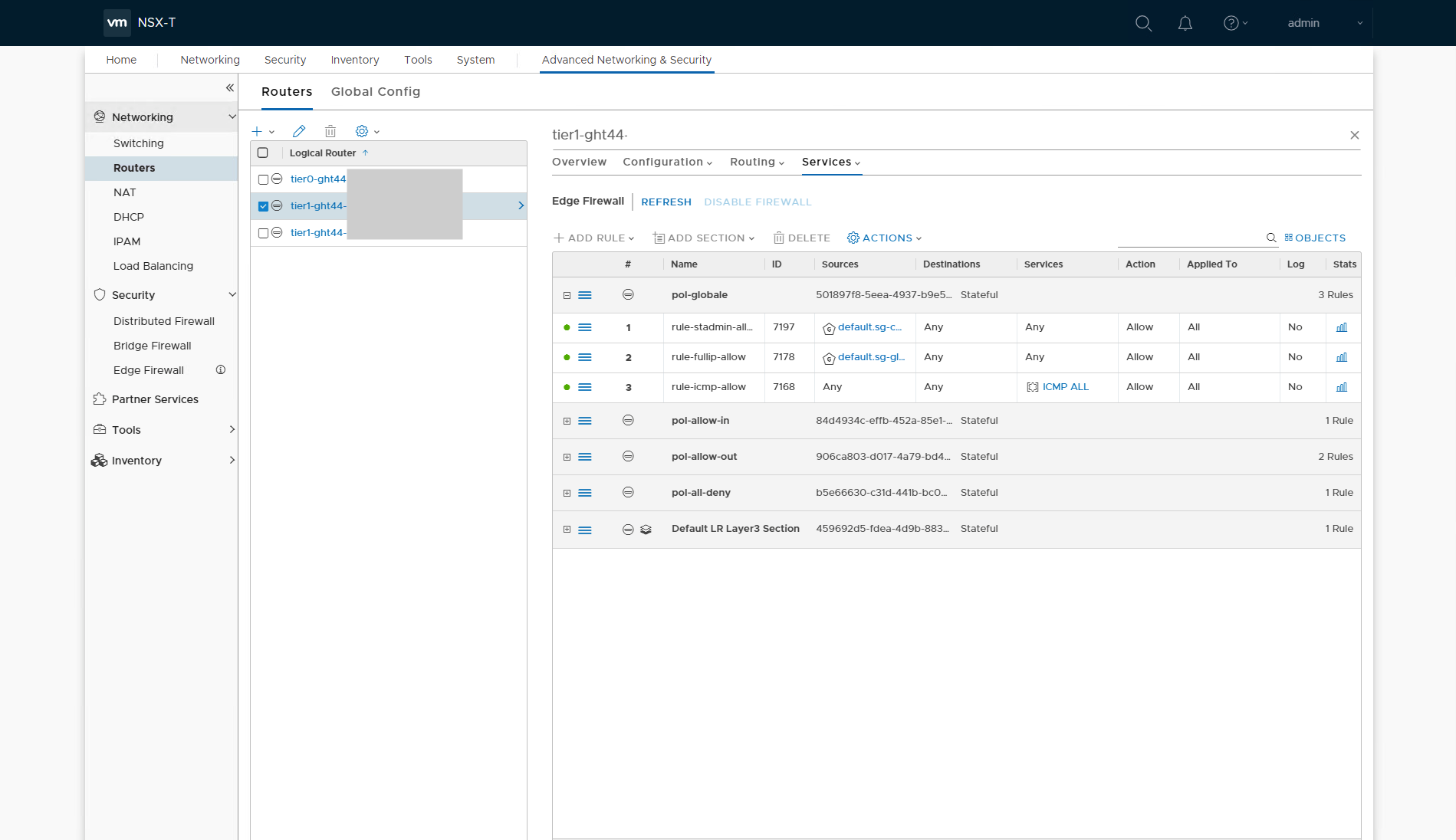 La encore pour obtenir le nom de la règle à partir de son ID, rendez-vous « Advanced Networking & Security->Security->Routers », cliquez sur le routeur concerné et placez-vous dans l’onglet « Services->Edge firewall ». Oui, ok, c’est un peu lourd, mais je pense que ça devrait s’arranger avec les futures versions de NSX-T… on ne sait jamais, peut-être dès la 2.5 qui devrait sortir incessamment à l’heure où j’écris ces lignes (1er Août 2019) :