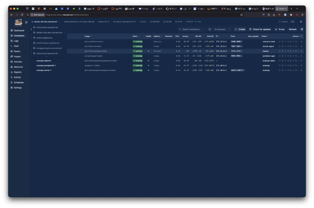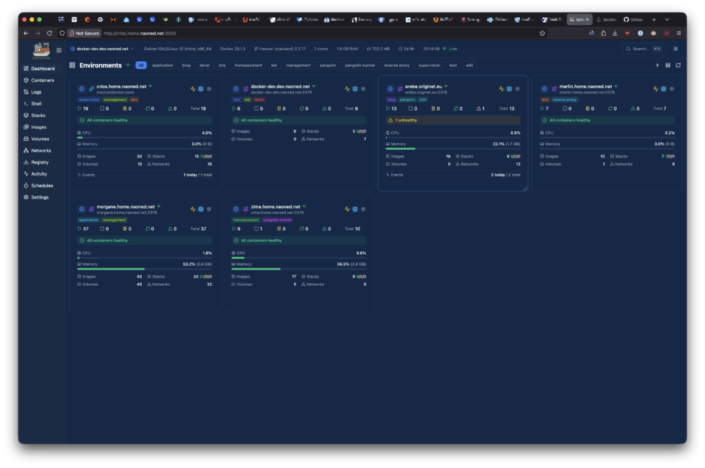 Dans la jungle des outils dédiés aux environnements conteneurisés, vous connaissez déjà, grâce à mes récents articles sur Pulse et Dozzle certains des très bonnes entrées en la matière, mais aussi Portainer, certainement, l’outil que j’utilise personnellement depuis plus de deux ans. J’appréciais (jusqu’à très récemment) Portainer pour sa puissance et sa compatibilité avec Swarm et Kubernetes, en plus de la gestion des stacks Docker et Podman autonomes. Aujourd’hui, Portainer est une plateforme mature et performante, mais de plus en plus orientée entreprise, avec des tarifs de licence qui restent acceptables pour un lab (5 nœuds maximum pour la version gratuite, si ma mémoire est bonne). En revanche, dès que l’on commence à gérer un nombre conséquent de serveurs logiques, les coûts deviennent rapidement prohibitifs… surtout pour moi, petit lab’er sans gros moyens.
