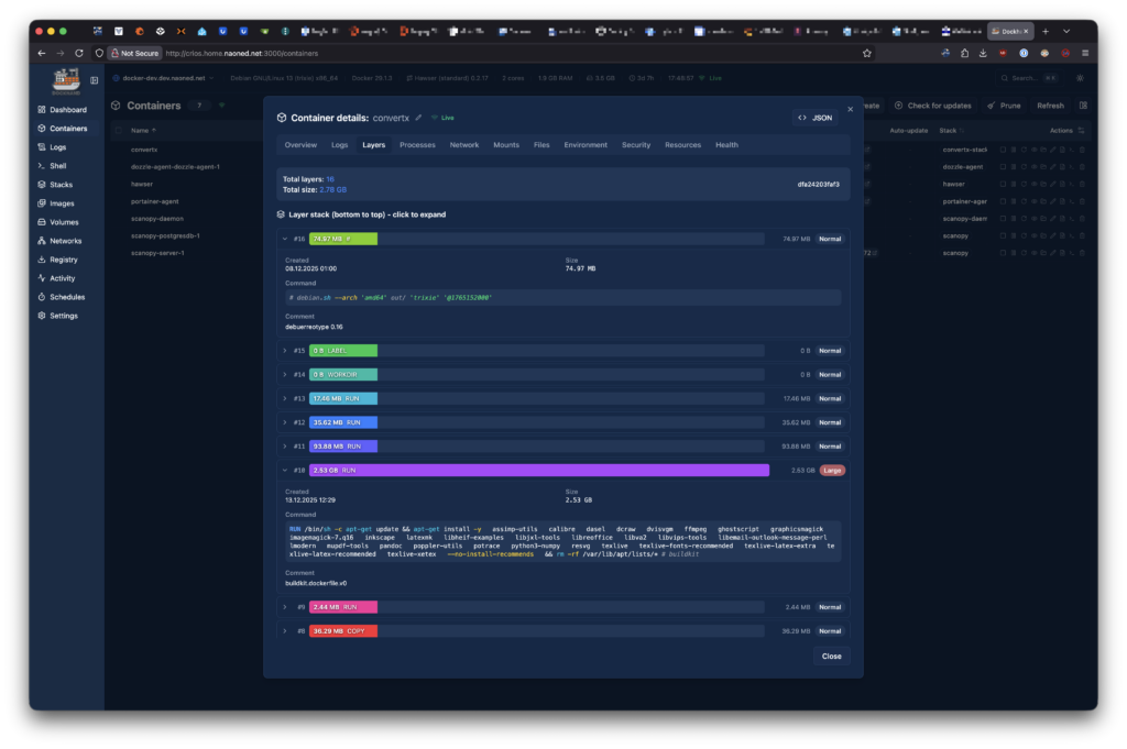 Vous remarquerez aussi la puissance des outils intégrés à la visualisation des conteneurs. On peut même parcourir directement et interagir avec le système de fichiers interne, sans avoir à galérer avec la cli. De même, il est possible de visualiser très simplement l’empilement des Layers , ce qui est parfait pour expliquer le concept de conteneur à une salle de formation, par exemple.