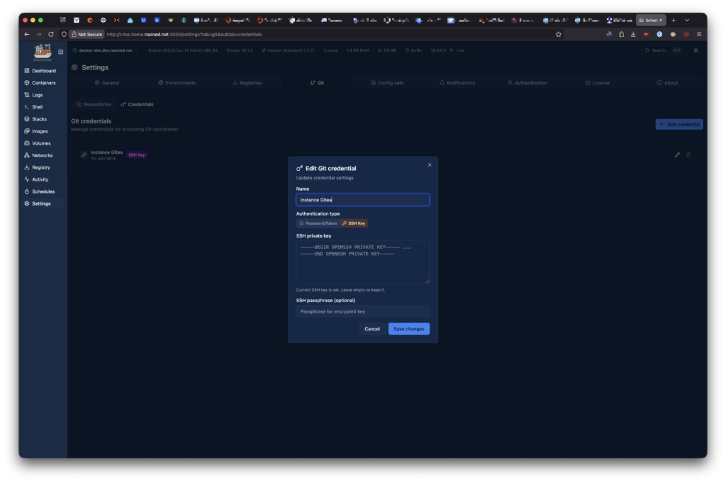Enfin, pour terminer, j’ai essayé d’utiliser directement les fonctions spécifiques de pipeline CI/CD, avec la possibilité de se connecter à un dépôt Git (GitHub/Lab/Tea, pour moi, c’est du thé, désolé ^^ !). J’ai utilisé ce dépôt pour déployer directement une stack basée sur Docker Compose, et ça a fonctionné parfaitement (bon, je n’en doutais pas, mais il faut bien commencer à vous titiller sur ces concepts…).