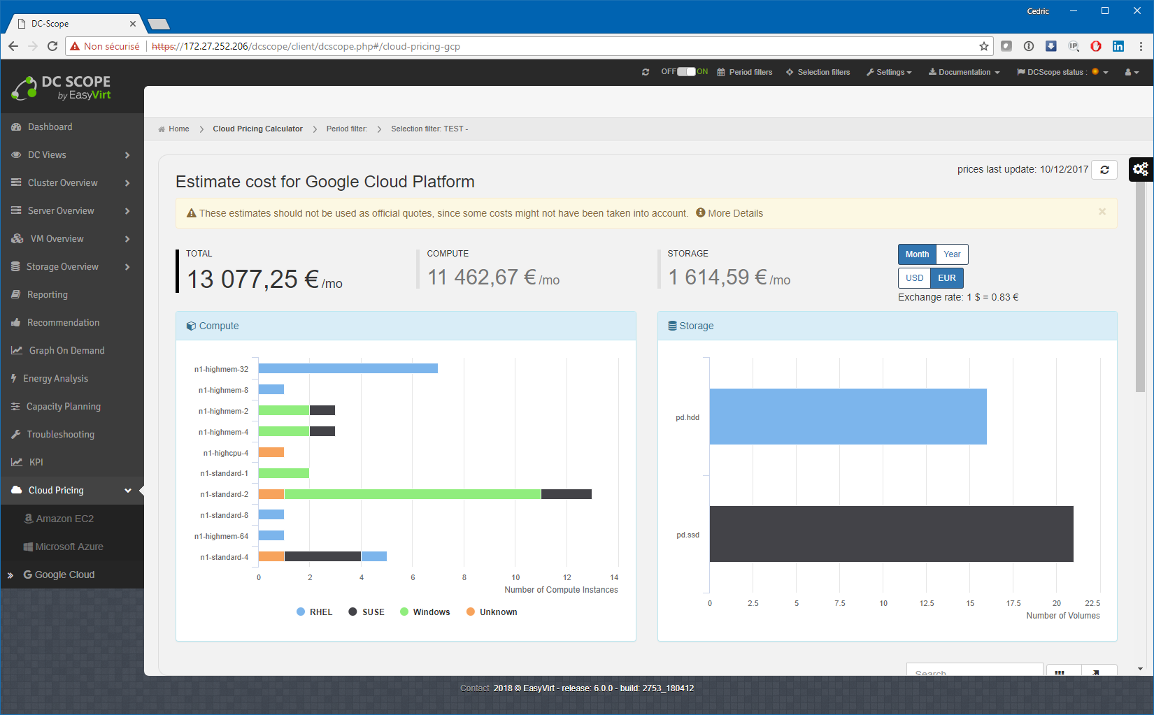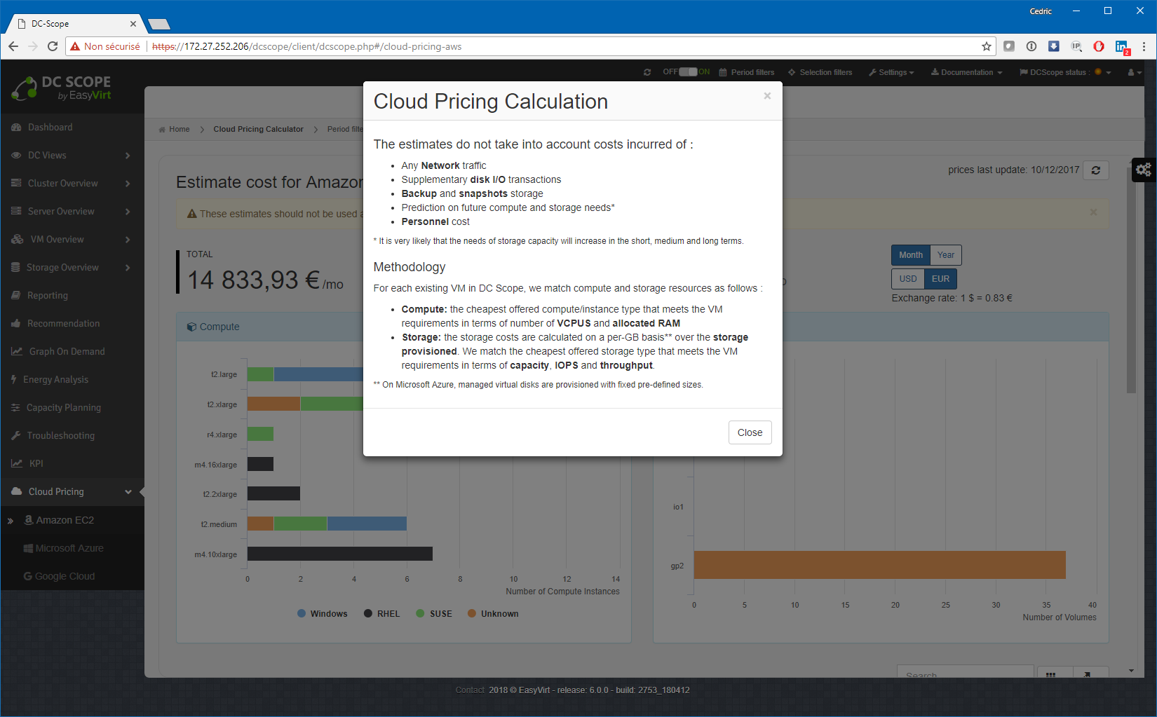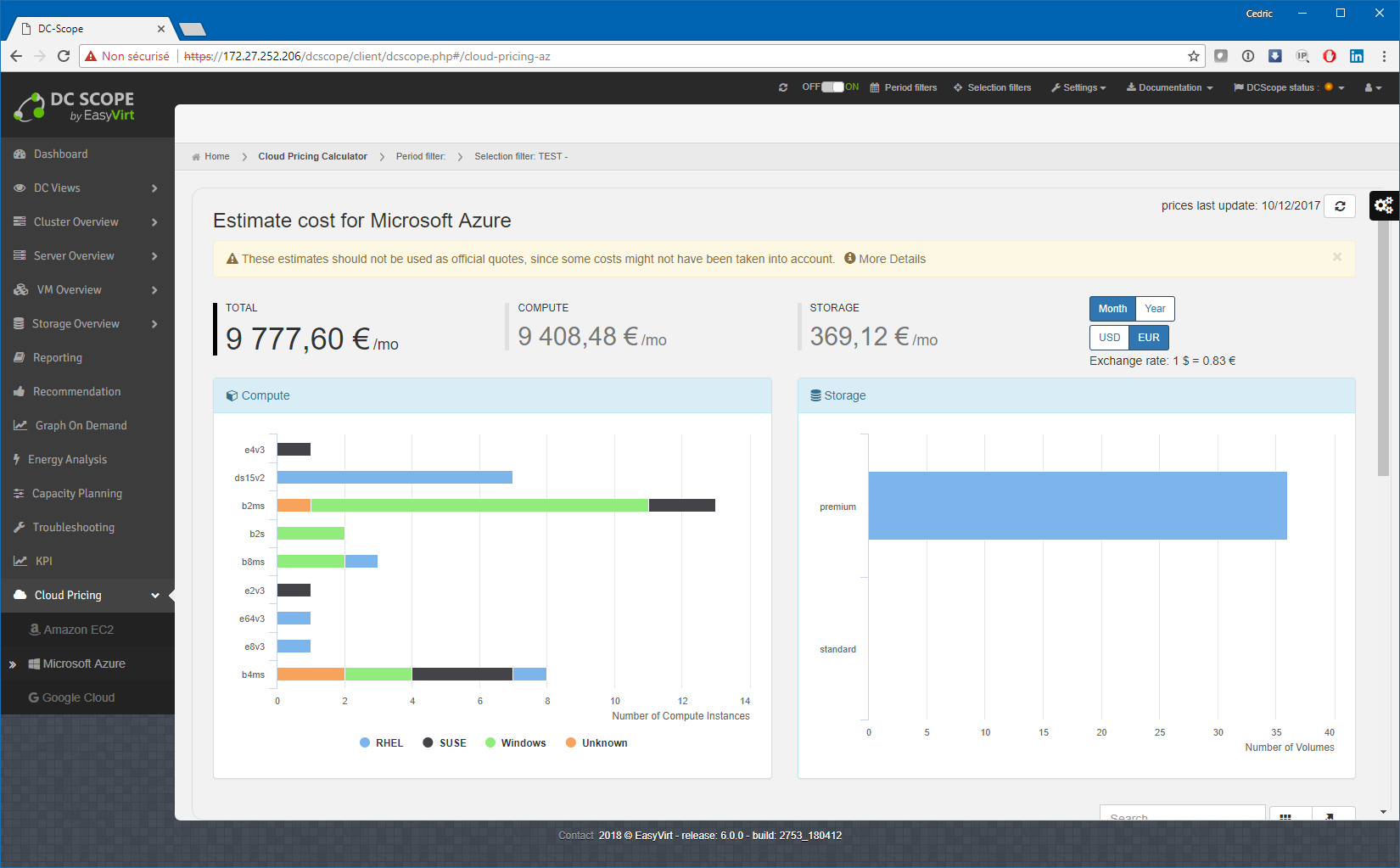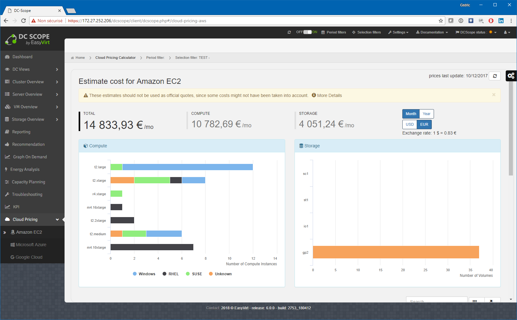 Enfin et comme une grosse partie de l’industrie désormais, DCScope v6 est capable, à partir des simulations de coûts déjà présentes depuis longtemps dans l’outil, de vous présenter une « facture hypothétique » des coûts d’hébergement en cloud public ! Qui plus est, ce calcul, tout comme une grosse partie des tableaux de bord DCScope, prend en compte le filtre actif ! La présentation « executive » est parfaite pour une réunion budgétaire ^^. Les trois principaux fournisseurs sont pris en charge : Google Cloud, Microsoft Azure et Amazon EC2. Il ne manque plus qu’OVH (Allez Martin, au boulot ^^) et ce sera parfait ! Notez tout de même que cette fonction est une option, non comprise dans l’offre de base.