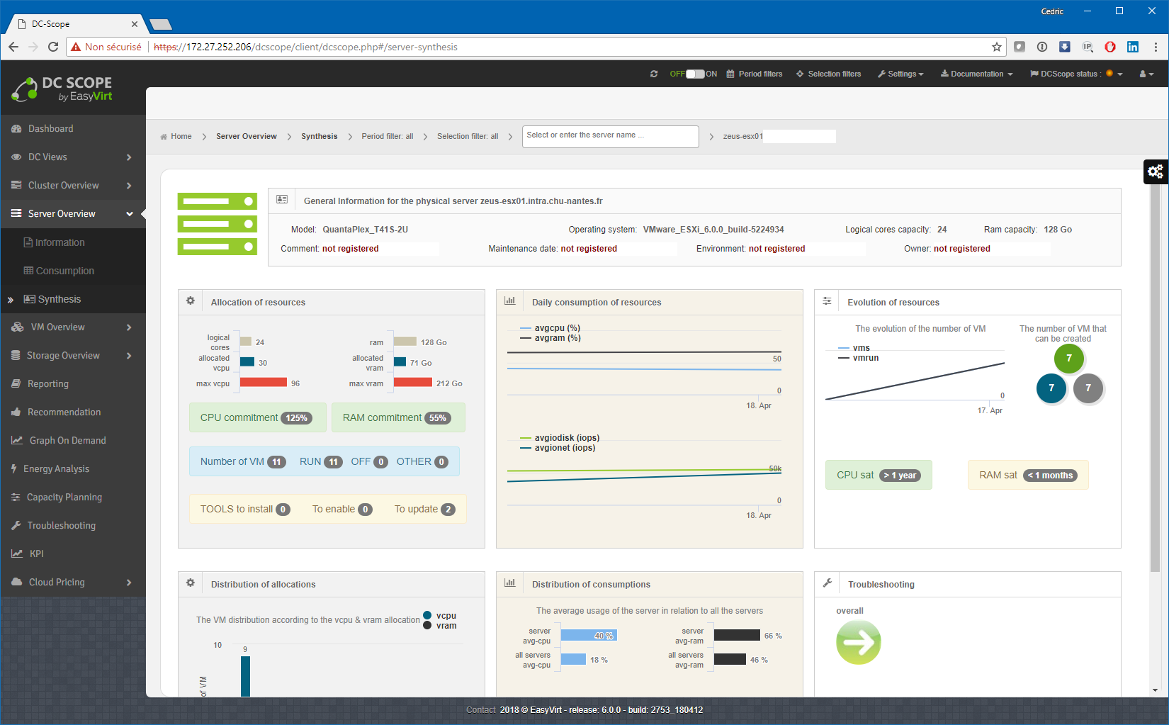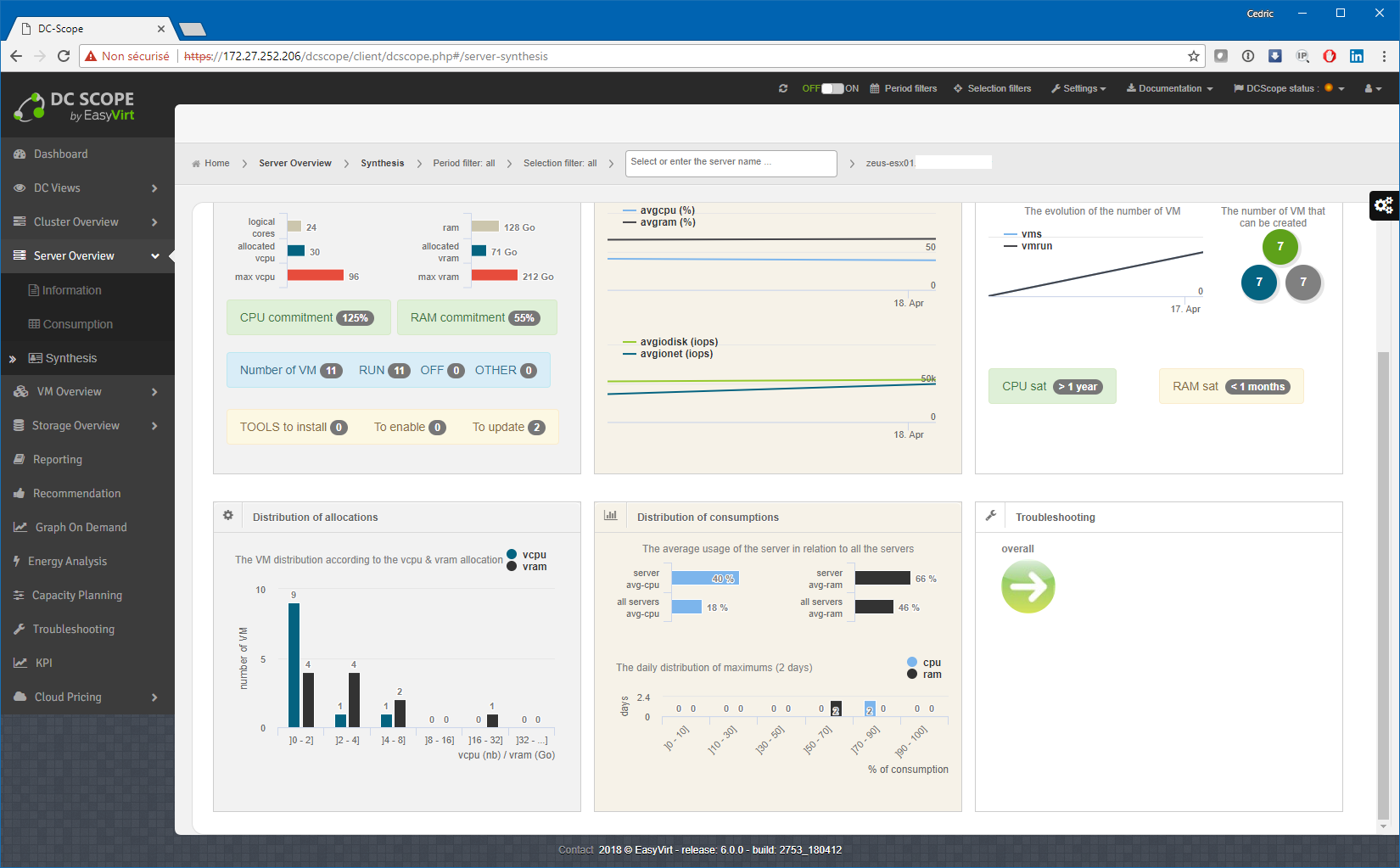 DCscope v6 inaugure de nouvelles présentations synthétiques dans les sections « Cluster overview » et « Server overview », à la manière de la fiche synthétique de VM introduite lors de la v4. On sent ici la maturité d’Easyvirt à nous proposer des vues très bien pensées et simples à lire. D’un seul coup d’œil, vous avez l’information globale de l’état de santé d’un cluster ou d’un serveur. Personnellement, j’adore :