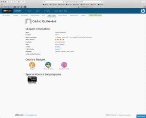 Le programme vExpert, qui n’est pas spécifique à VMware (d’autres sociétés propose des choses similaires, comme Cisco Champion, Microsoft MVP ou Citrix CTA, notamment), est un programme de selection de professionnels de tout poil, autant chez les clients que les intégrateurs ou même constructeurs, qui récompense toute personne ayant activement contribué à la communauté VMware, que ce soit via des publications de type média/blog, ou via l’organisation d’events spécifiques ou même leur participation à des communautés actives (forums/reddit ou autre). C’est simple : vous êtes un minimum actif et/ou reconnu dans la sphere IT autour de VMware et de son écosystème, vous pouvez prétendre à devenir vExpert. Si vous êtes choisi, vous obtenez ce « titre » pour un an, renouvelable évidemment, si vous restez actif.