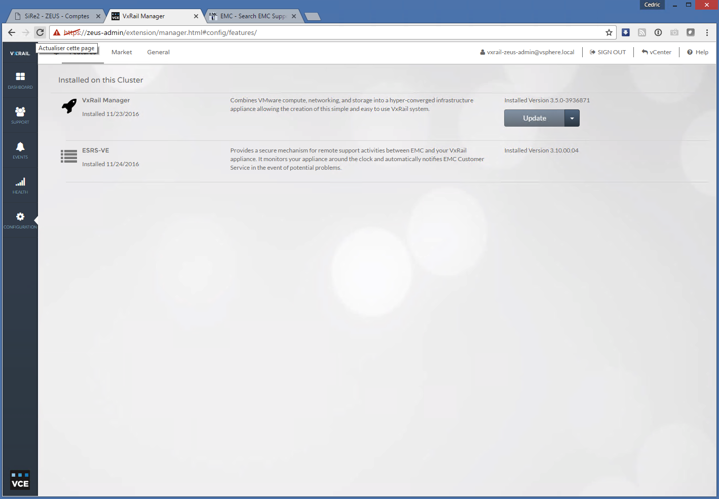 Je vais tout de suite vous décevoir … c’est d’une simplicité presque banale et finalement un peu frustrante pour moi, qui aime tant que « cela se complique ». Oui, j’ai donc réalisé l’upgrade de notre cluster en moins de 15 minutes, directement depuis le VxRail Manager, dans la section ad-hoc. Je résume à grand trait :