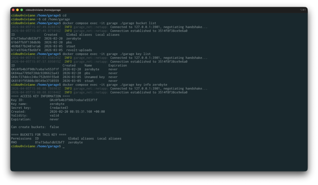 Voici les screenshots des deux solutions. Personnellement, en tant que fanatique de la CLI, je préfère Garage. Cela dit, RustFS a aussi l’air très bien… À vous de tester et de choisir celle qui vous convient le plus !