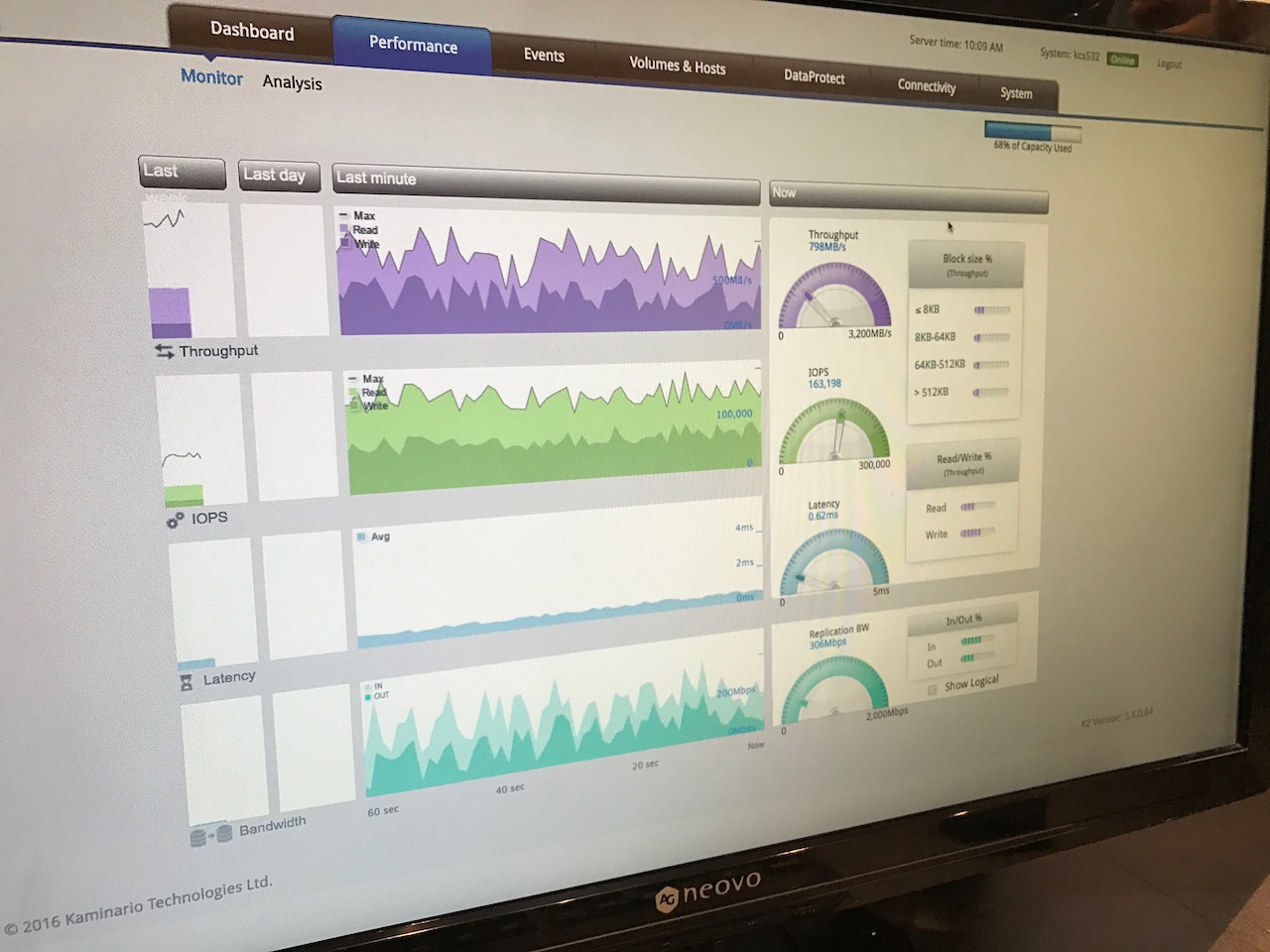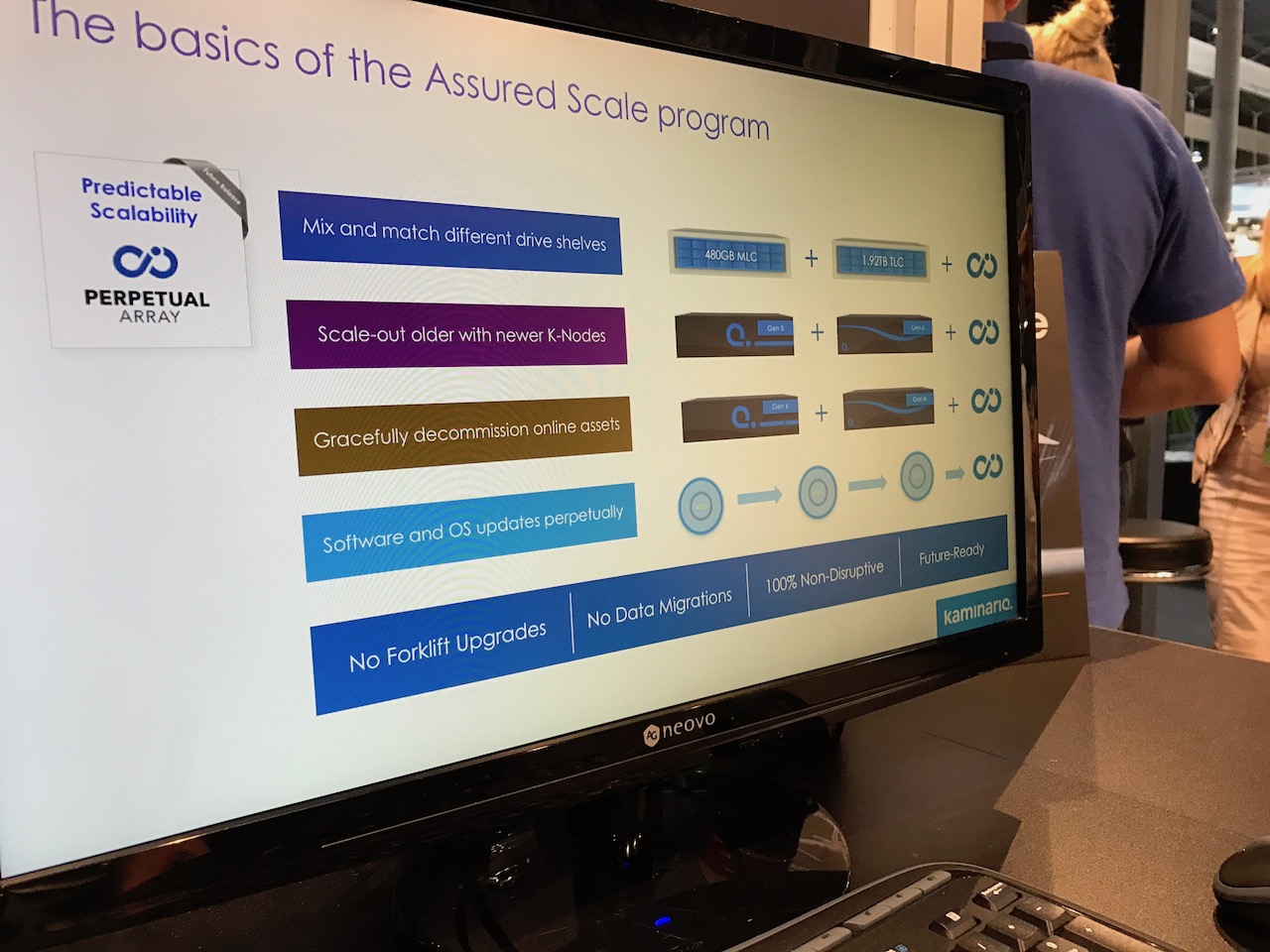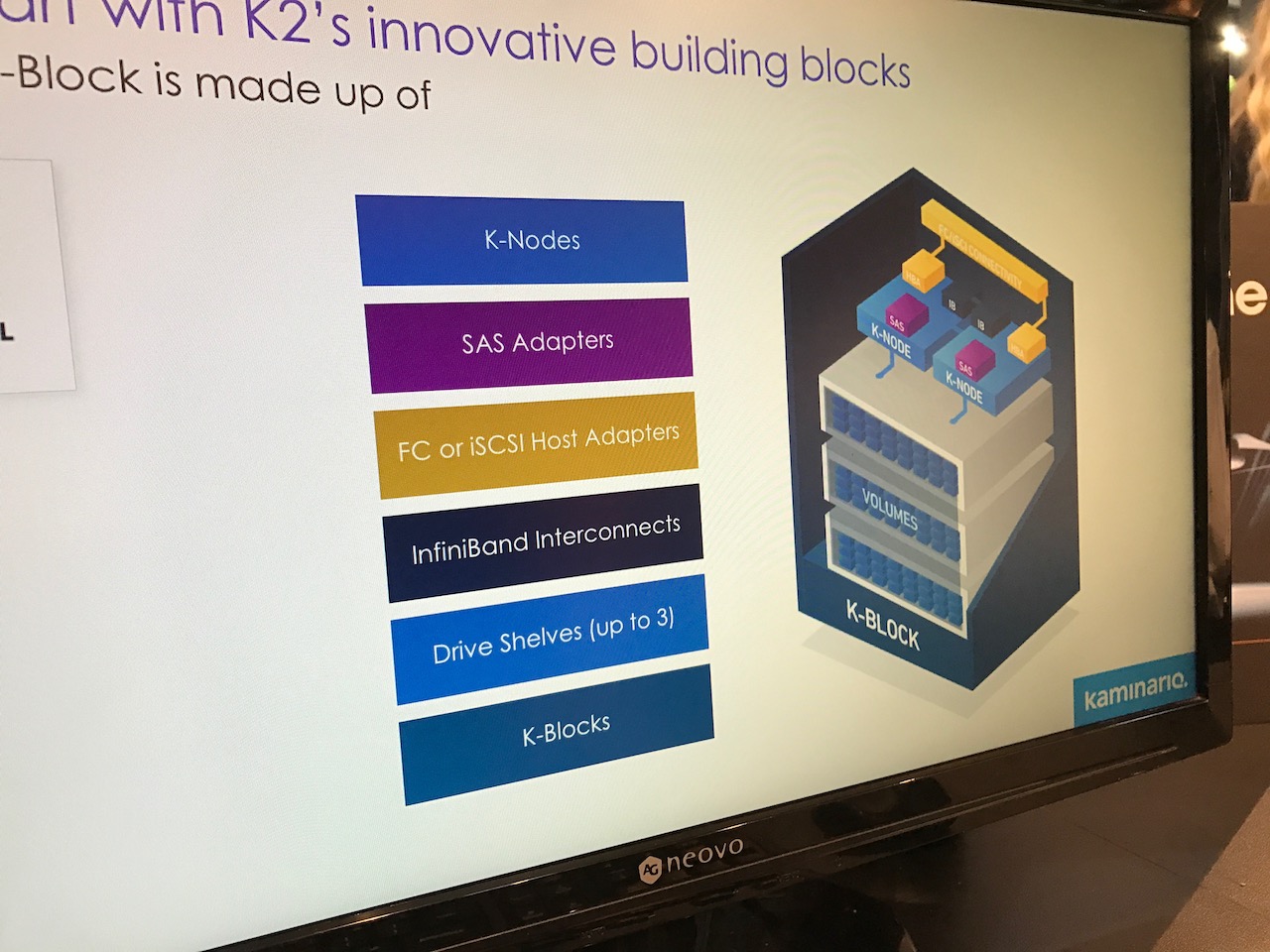 Aujourd’hui Kaminario se veut le porte drapeau de la « troisième génération » de baies full-flash, avec deux concepts forts : une solution totalement agnostique au matériel utilisé (mais elle vend tout de même des appliances, pas seulement du software, contrairement à Atlantis par exemple) et extensible en scale-up et scale-out.