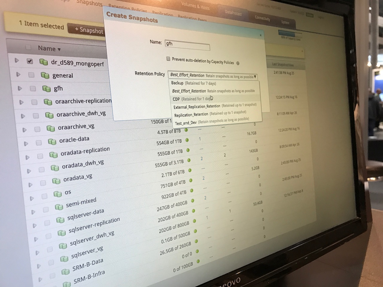 Sur cette base hardware de type commodity, Kaminario installe sa solution logicielle dont certaines fonctionnalités lui permettent de se démarquer de la concurrence. Si la déduplication (globale à l’ensemble des données de la baie), la compression et bien entendu le thin provisionning forment les features de base de K2, il est possible d’activer ou désactiver à loisir la dédup sur chaque volume, lors de sa création. En fonction de certains cas d’usage, cette possibilité permet de gagner en bande passante et un peu en latence.