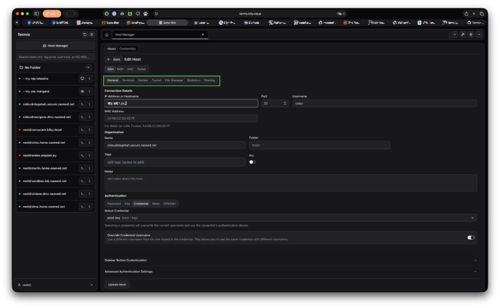 Je vous conseille d’y jeter un œil, voire les deux, car, à la vue des nombreux sponsors, notamment rien moins que Cloudflare, Digital Ocean et Akamai, pour n’en citer que quelques-uns, m’est avis qu’il risque d’évoluer rapidement ! Pour l’instant, autant les fonctions SSH (terminal, gestionnaire de fichiers ou inventaire Docker) fonctionnent bien, autant le RDP et le VNC posent problème (impossible de les faire fonctionner).