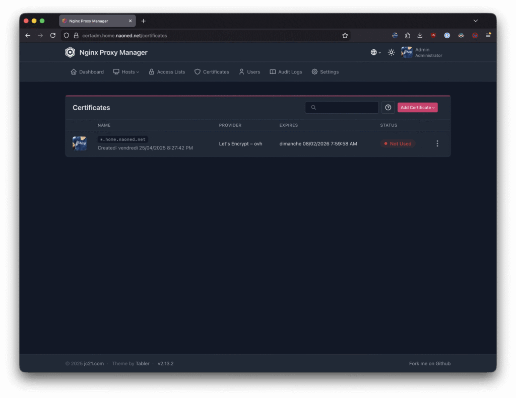 En pratique, c’est relativement connu et simple : j’utilise donc Nginx Proxy Manager pour centraliser la gestion des certificats, à la fois intuitive et suivie. Deux raisons motivent ce choix : la simplicité d’utilisation et le suivi automatique des renouvellements. Même si l’objectif à terme est d’automatiser l’ensemble du processus, la confiance ne doit jamais exclure le contrôle, qu’il soit humain ou technique.