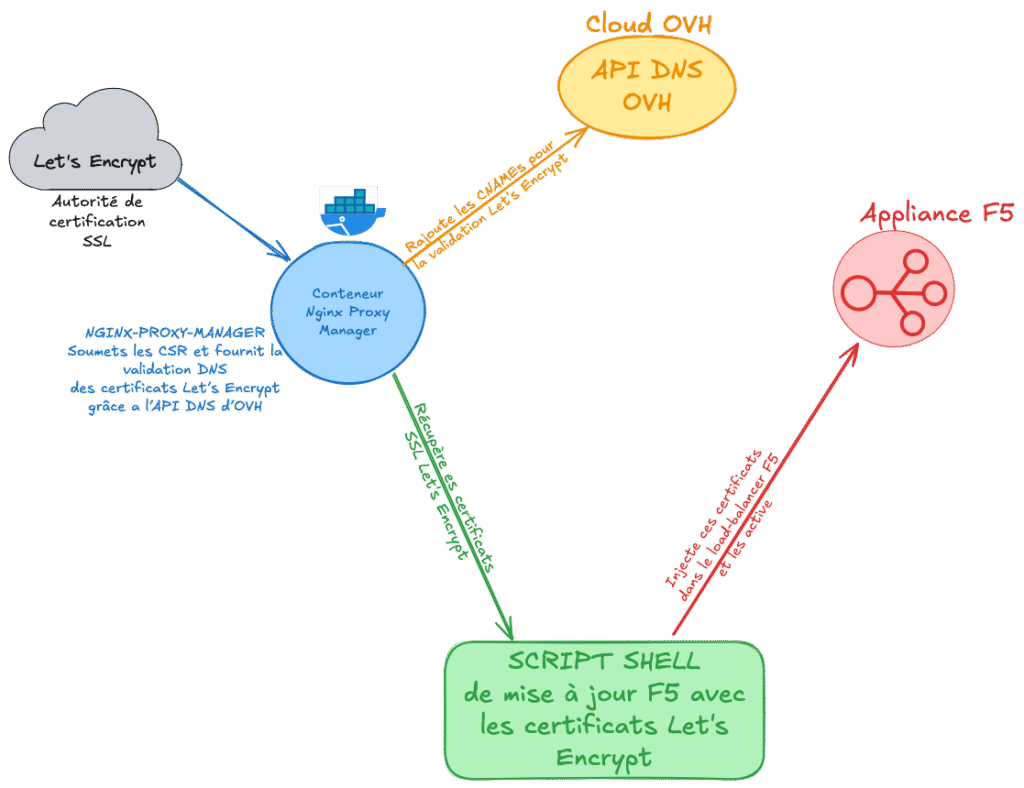 Hello les gens ! j’espère que tout le monde va bien. Aujourd’hui, on reste dans la pure technique avec un système que je suis en train d’évaluer chez nous, pour utiliser et dans la mesure du possible automatiser la mise à jours de certificats SSL publiques via Let’s Encrypt et injecter ceux-ci dans nos load balancers F5/BigIP.