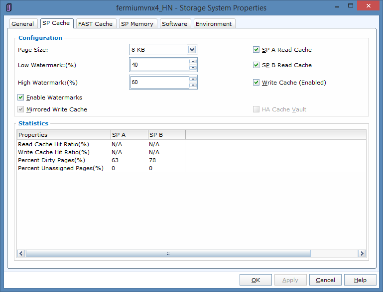 Si vous avez l’habitude de ces environnements, vous connaissez surement les différents paramètres qui prévalent au dimensionnement et au tuning du cache VNX. En substance, vous pouvez jouer sur 3 paramètres : la taille des blocks cachés, le low watermark et le high watermark. La taille des blocks est finalement assez rarement modifiée car pour des baies généralistes, on choisit souvent une taille médiane ni trop petite ni trop grande (cela peut être utile de réduire un peu pour avoir plus de granularité dans le cache si vous ne faite que du transactionnel avec des petites I/O par exemple). Par contre, les watermark low et high sont souvent établis en fonction d’une activité donnée sur la baie. Ces deux indicateurs établissent une règle de « purge du cache » en cas d’afflut d’I/O en écriture. Le HWM indique qu’à partir de XX % de remplissage du cache en écriture, la baie doit « flusher » les blocks actuellement en cache… jusqu’à atteindre le LWM. On a coutume de dire qu’un cache parfait devrait toujours être à 100%… mais pas plus. En effet, si le cache est full, toutes les nouvelles I/O sont mises en attente par les SP et la latence augmente mécaniquement pour tous les clients de la baie.