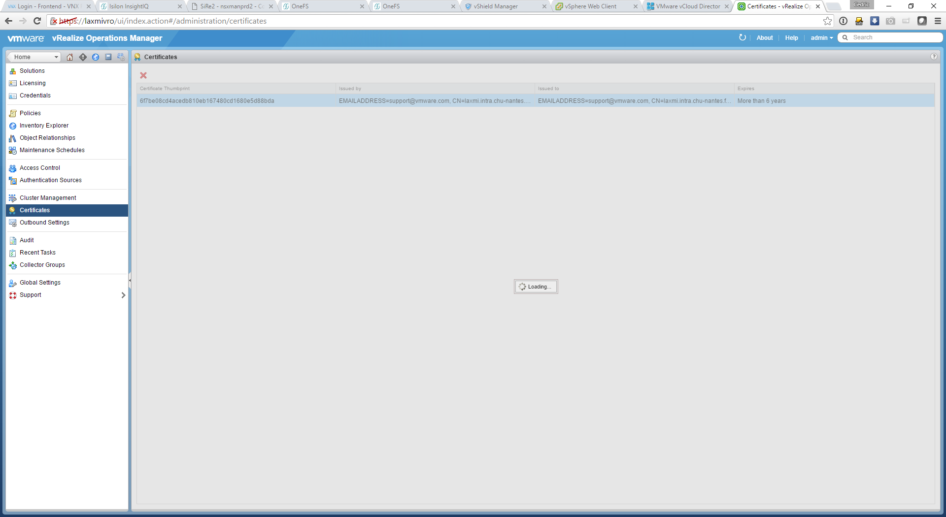 Enfin, nous avons reconnecté vRealize Operations. Il a fallut, comme pour vShield Manager, procéder à la suppression de l’empreinte du certificat public de vCenter avant de relancer le plug-in correspondant. Pour le coup, c’était relativement simple car il y a une section spécifique dans l’interface d’administration pour gérer ces éléments :