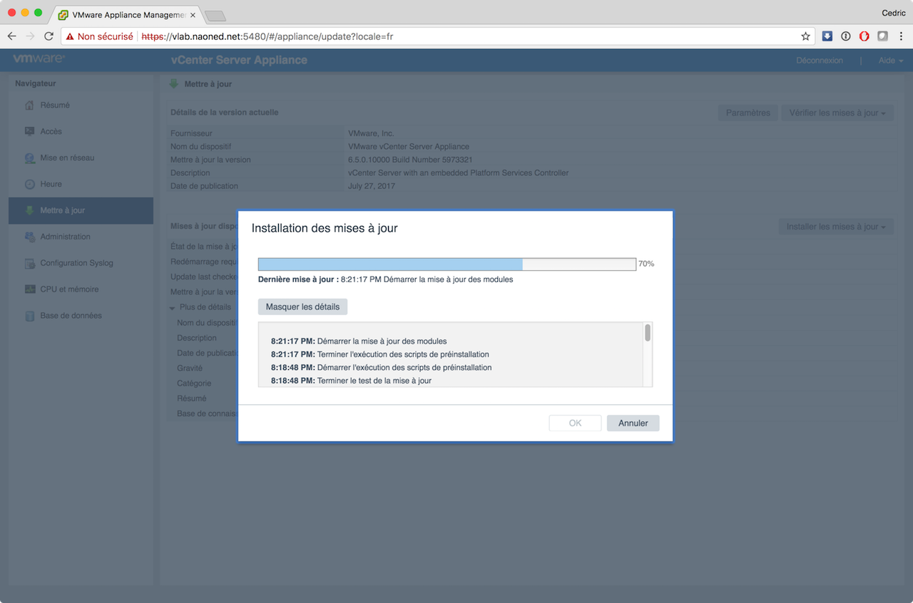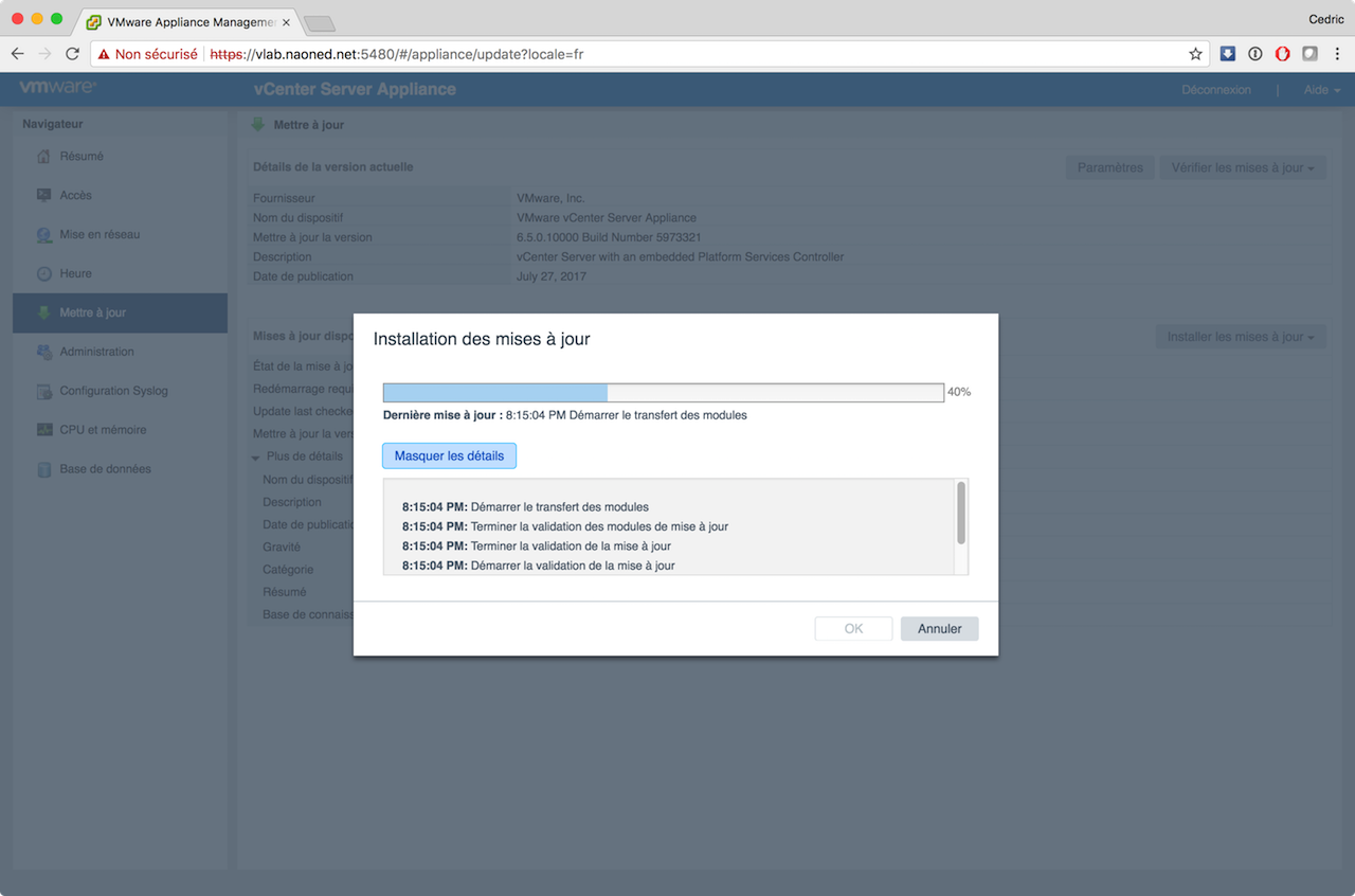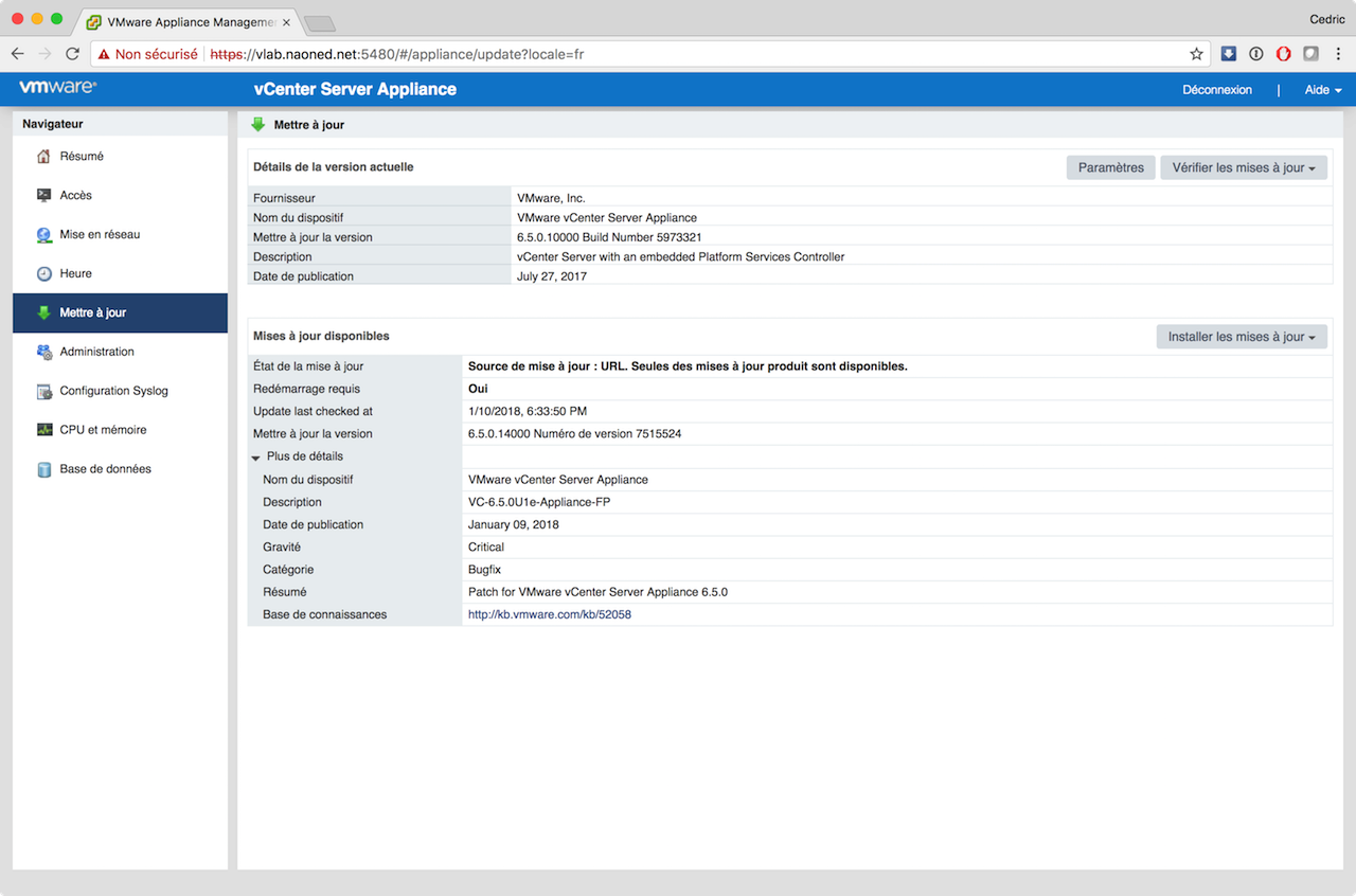 Désormais, avec VCSA, les mises à jours sont sensées être parfaitement intégrées, simples, rapides, efficaces et j’en passe ? J’ai donc procédé hier soir à cette mise à jour via mon vLab, en utilisant le moyen le plus simple possible : vérification online, téléchargement direct, installation via le bouton « update », et tout cela sur le site d’admin dédié de la VCSA (sur le port 5480).