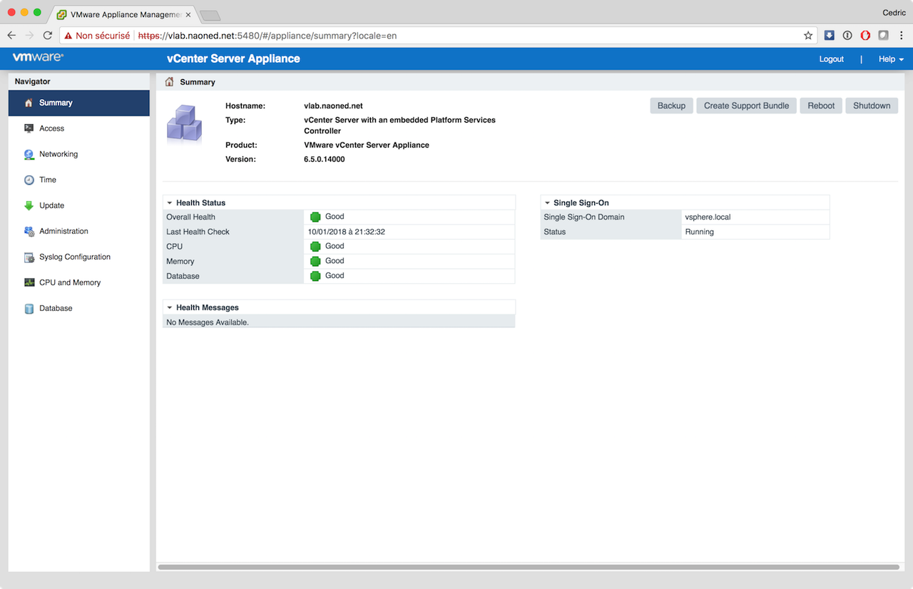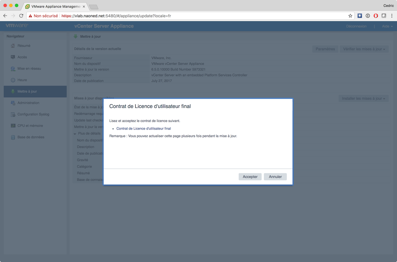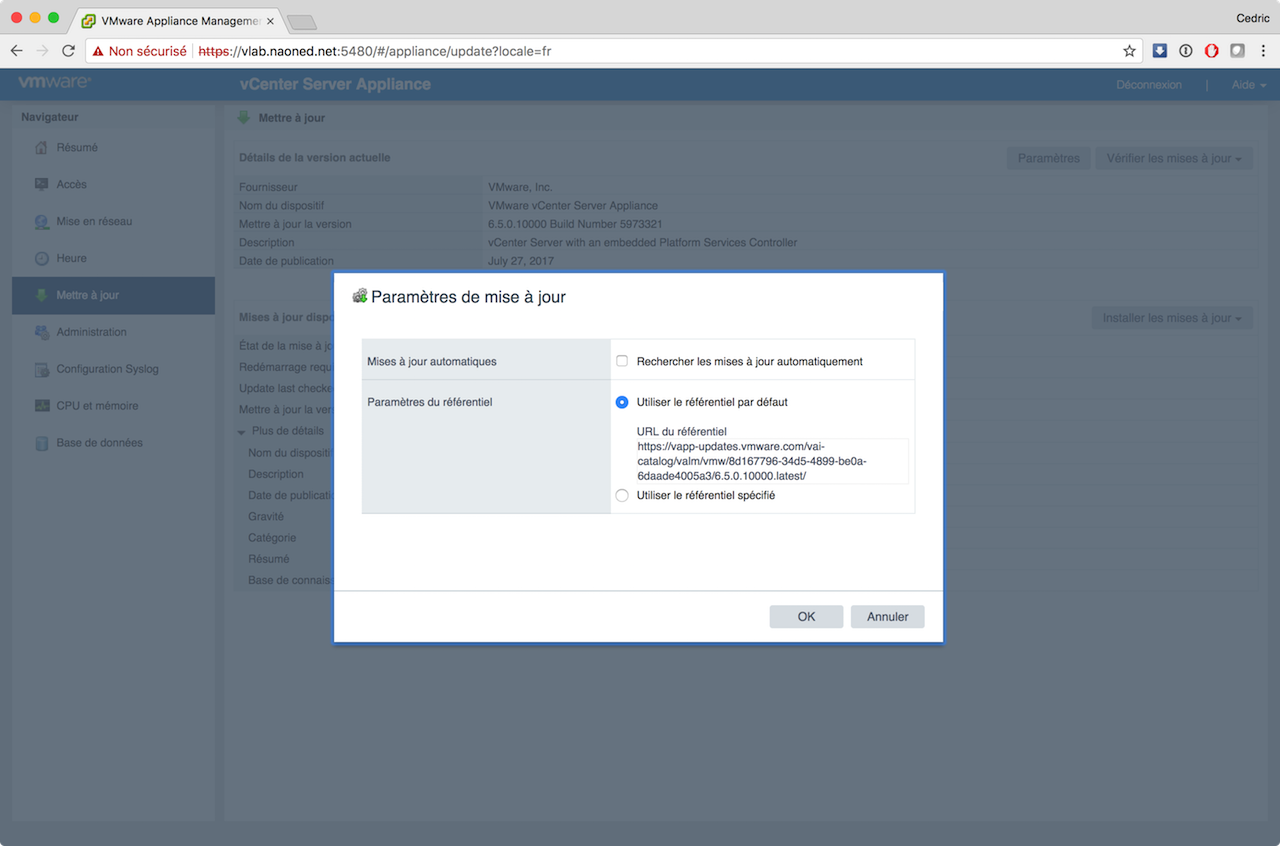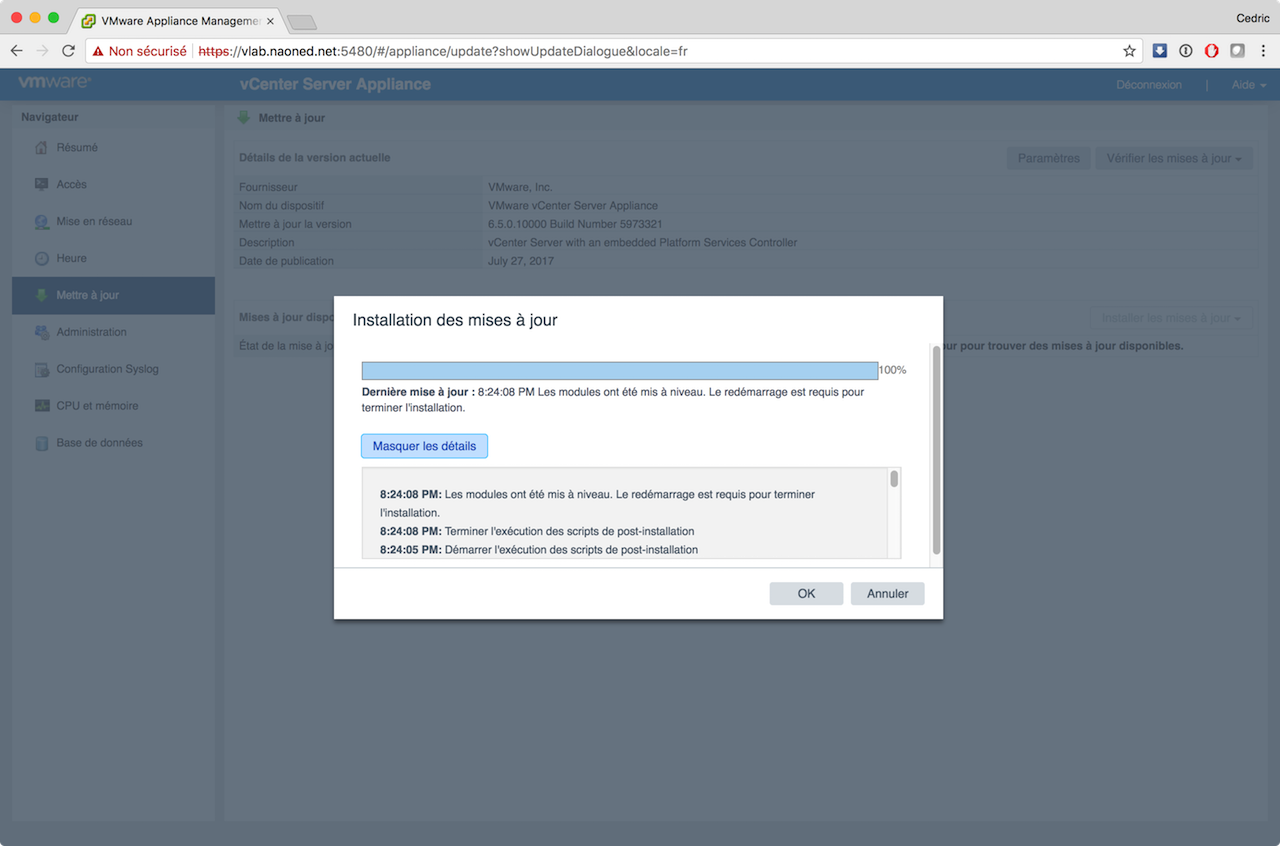 Désormais, avec VCSA, les mises à jours sont sensées être parfaitement intégrées, simples, rapides, efficaces et j’en passe ? J’ai donc procédé hier soir à cette mise à jour via mon vLab, en utilisant le moyen le plus simple possible : vérification online, téléchargement direct, installation via le bouton « update », et tout cela sur le site d’admin dédié de la VCSA (sur le port 5480).