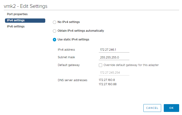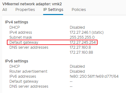 L’IP de management du witness était pingable, mais l’ip « VSAN » ne l’était pas depuis la vmkernel VSAN du serveur. En gros, « on a un souci de gateway, très vraisemblablement ». Bingo. En regardant dans la configuration réseau du vmkernel VSAN, je constate que la gateway est celle « par défaut » de l’ESXi (donc du management).