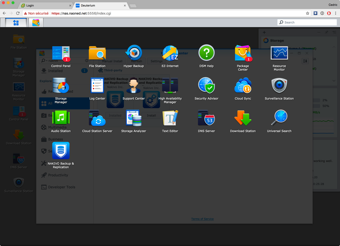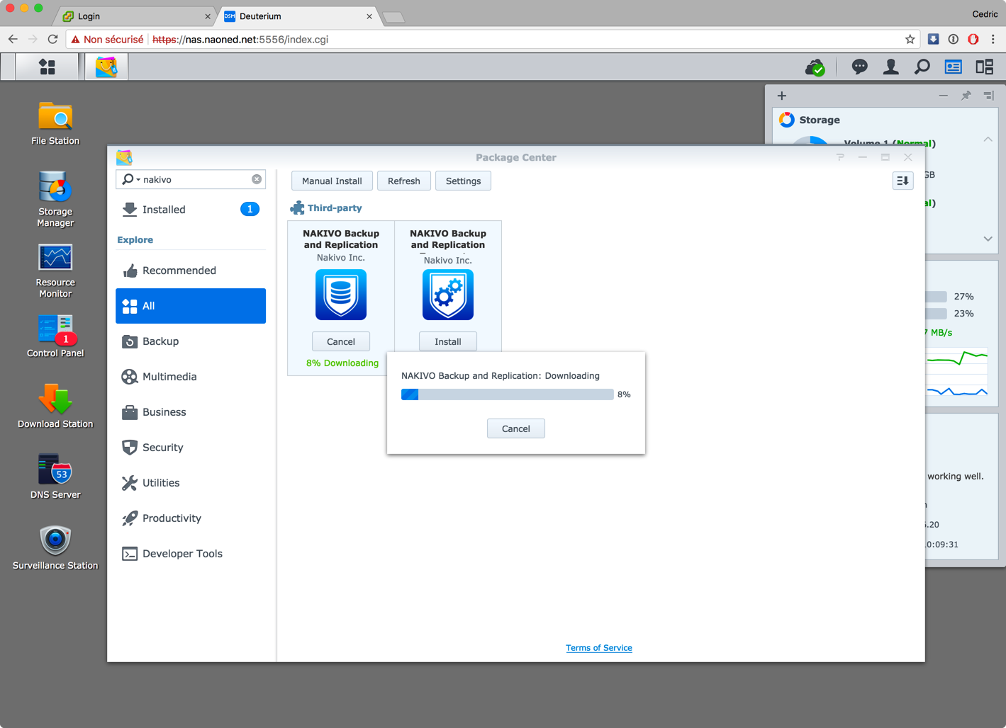 Une fois éteinte la machine virtuelle Nakivo 7.1, on installe le package de la 7.2 sur le NAS. Quelle belle surprise, même pas besoin d’uploader le package disponible sur le site de l’éditeur, en effet, Nakivo est directement disponible dans le Package Center de Syno. Clic, installe … terminé !