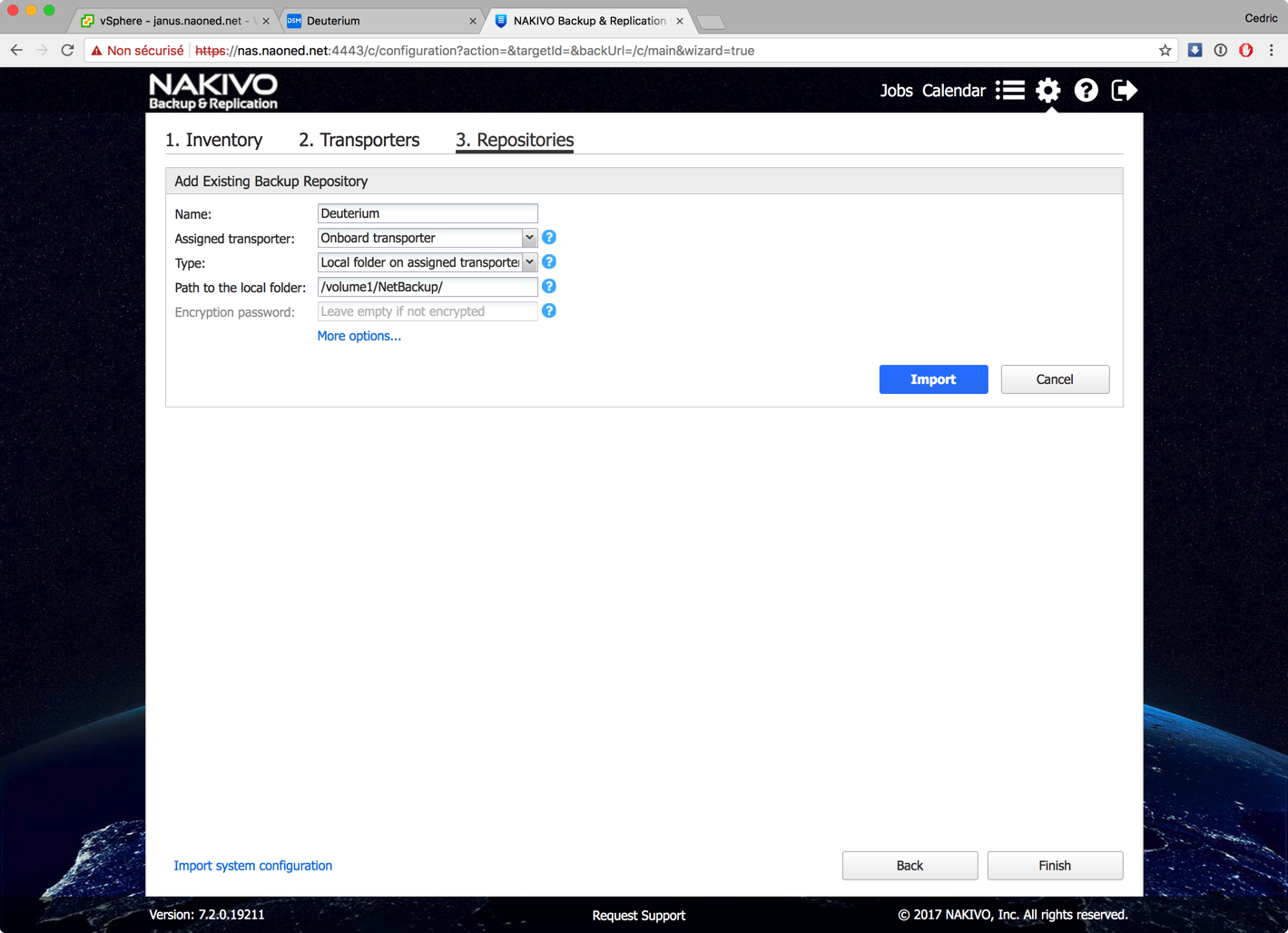 Quitte à réinstaller la solution, autant tester le ré-import des données de l’emplacement des backups de la 7.1. J’ai donc re-connecté le même chemin que précédemment, mais cette fois-ci en local sur le NAS (alors qu’avant, ce repo était accédé via du CIFS). Aucun souci, là encore, les anciens backups ont été retrouvés directement.