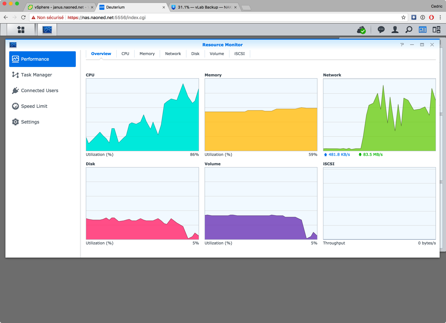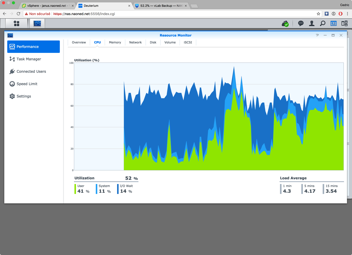 On peut noter aussi que coté NAS, on sent la charge de travail du backup, mais que cela reste tout à fait gérable par le proceseur (un Atom double coeur dans le cas du DS 1513+).