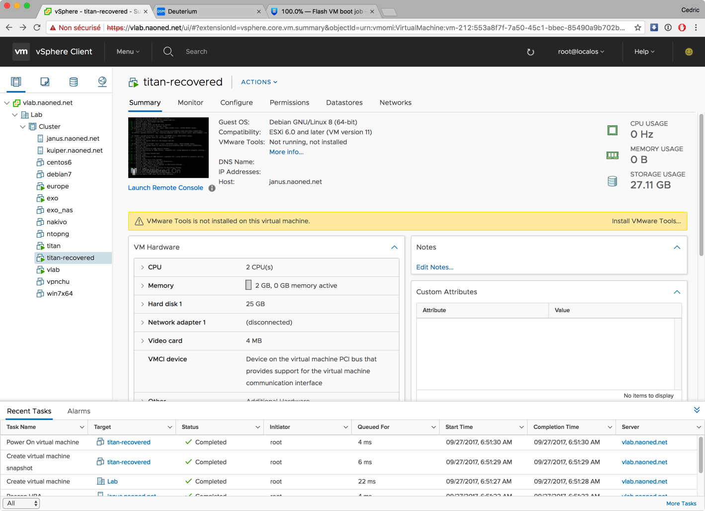 Le test ultime consiste bien sûr à procéder à un backup puis une tentative de restauration (le plus important en fait ^^). J’ai donc lancé un backup forcé, suivi sa progression (une petite demi-heure) puis enfin testé l’instant recovery et le boot de la machine virtuelle choisie. Sans surprise, tout a marché du premier coup, même pas une petite erreur à la resto… c’est presque décevant, du coup je n’ai rien d’autre à vous dire 🙂