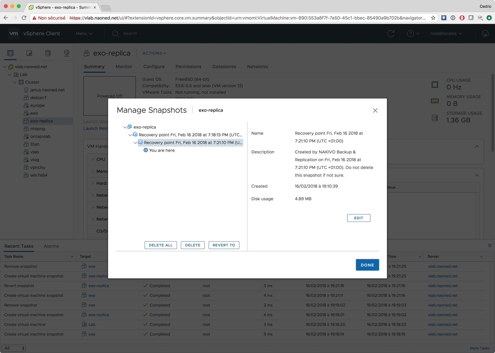 On pourra également noter que les différentes réplications incrémentales de la VM sont historisées via des snapshots VMware, ce qui permet de remonter très vite à une image fonctionnelle, toujours sans être obligé de procéder à la restauration complète de la VM source. Nakivo utilise bien entendu toutes les optimisations disponibles autant coté vSphere avec le CBT que via sa fonction backup classique avec la compression réseau pour réaliser ces copies.