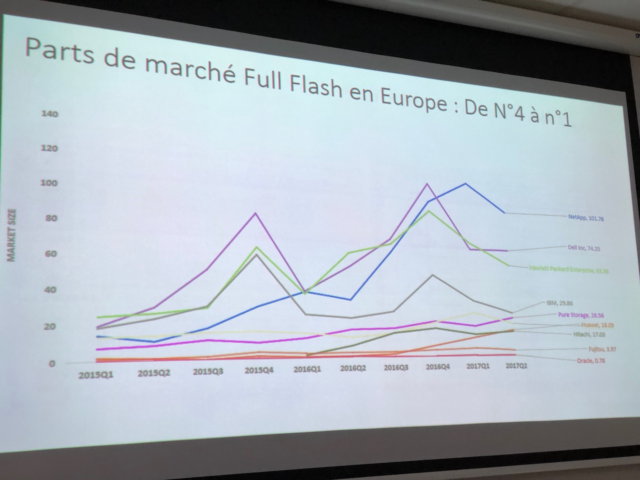 De plus, la plupart des indicateurs financiers sont actuellement au vert, notamment sur le segment SAN où l’entreprise est encore en croissance face à ses principaux concurrents, HP ou Dell EMC en tête, dans un marché par ailleurs atone. Les raisons principales, du point de vue du constructeur sont : une offre claire et simple, mais complète, un positionnement tarifaire compétitif, des algorithmes de QoS et d’optimisation/réduction de donnée très efficaces et un ensemble d’outils de migration performants. Si l’on rajoute à cela des engagements contractuels sur les taux de réduction de données, on obtient une offre très attractive. Je veux bien les croire, tant je trouve, pour ne parler que de Dell EMC, que la pléthore de solutions disponibles brouille beaucoup le message commercial actuellement.