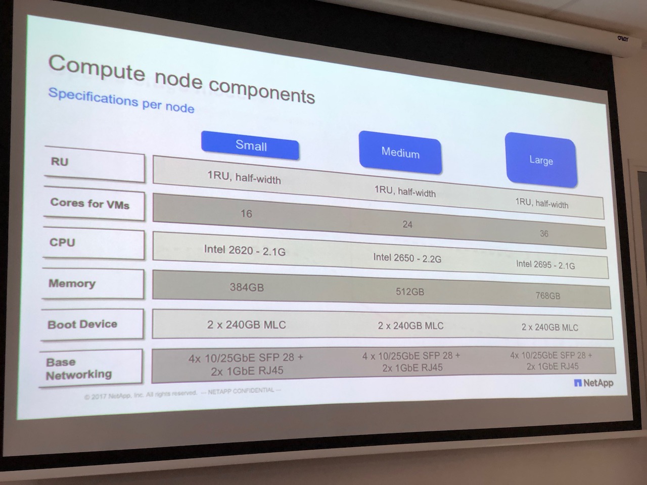 Pour terminer, sachez que Netapp livre ses ensemble dans des chassis haut densité 2U disposant chacun de 4 slots serveurs et de 24 emplacements disque, comme ses concurrents. Le minimum pour un cluster fonctionnel aujourd’hui est constitué de 4 noeuds de stockage et 2 noeuds de compute.