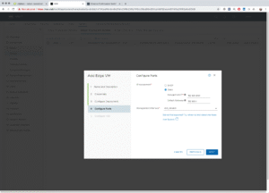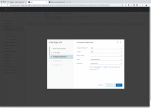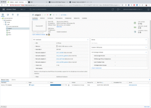 Notre Edge va disposer d’un ensemble de 3 interfaces configurées : une première interface de management, portant l’ip correspondante (192.168.1.8/24), une seconde interface qui va être connecté à notre vlan d’overlay GENEVE, le vlan 300, et une troisième qui va être branché sur un dvPortGroup en mode trunk. Son déploiement est automatique, comme vous pouvez le voir sur le screenshot vSphere. NSX-T importe une ova dans le cluster/host qu’on a indiqué et la paramètre directement.