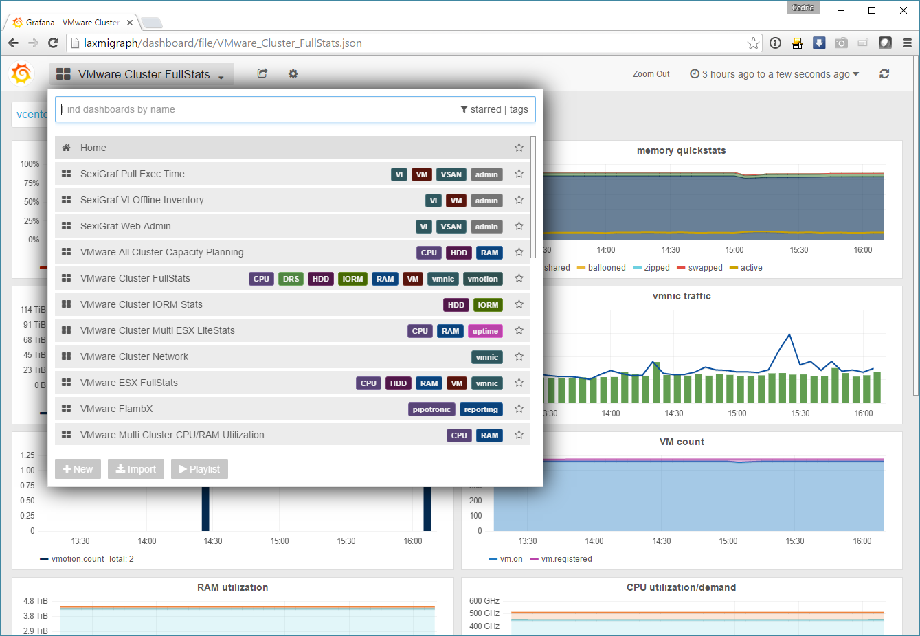 Dès que votre vCenter est enregistré et que les options de récolte sont activées (Virtual Infrastructure et/ou VSAN), SexiGraf va poller toutes les 5 minutes votre serveur et récolter l’ensemble des métriques dont il a besoin pour commencer à alimenter ses graphiques. Ensuite, et bien… vous prenez votre pot de popcorn et vous admirez (et analysez ^^) la consolidation réalisé. Je vous ai mis quelques copies d’écran ci-dessous pour vous faire une idée du potentiel de la solution, mais honnêtement, vu la simplicité d’installation et de mise en oeuvre, prenez 15/30 minutes pour l’installer directement en connectant votre vCenter !