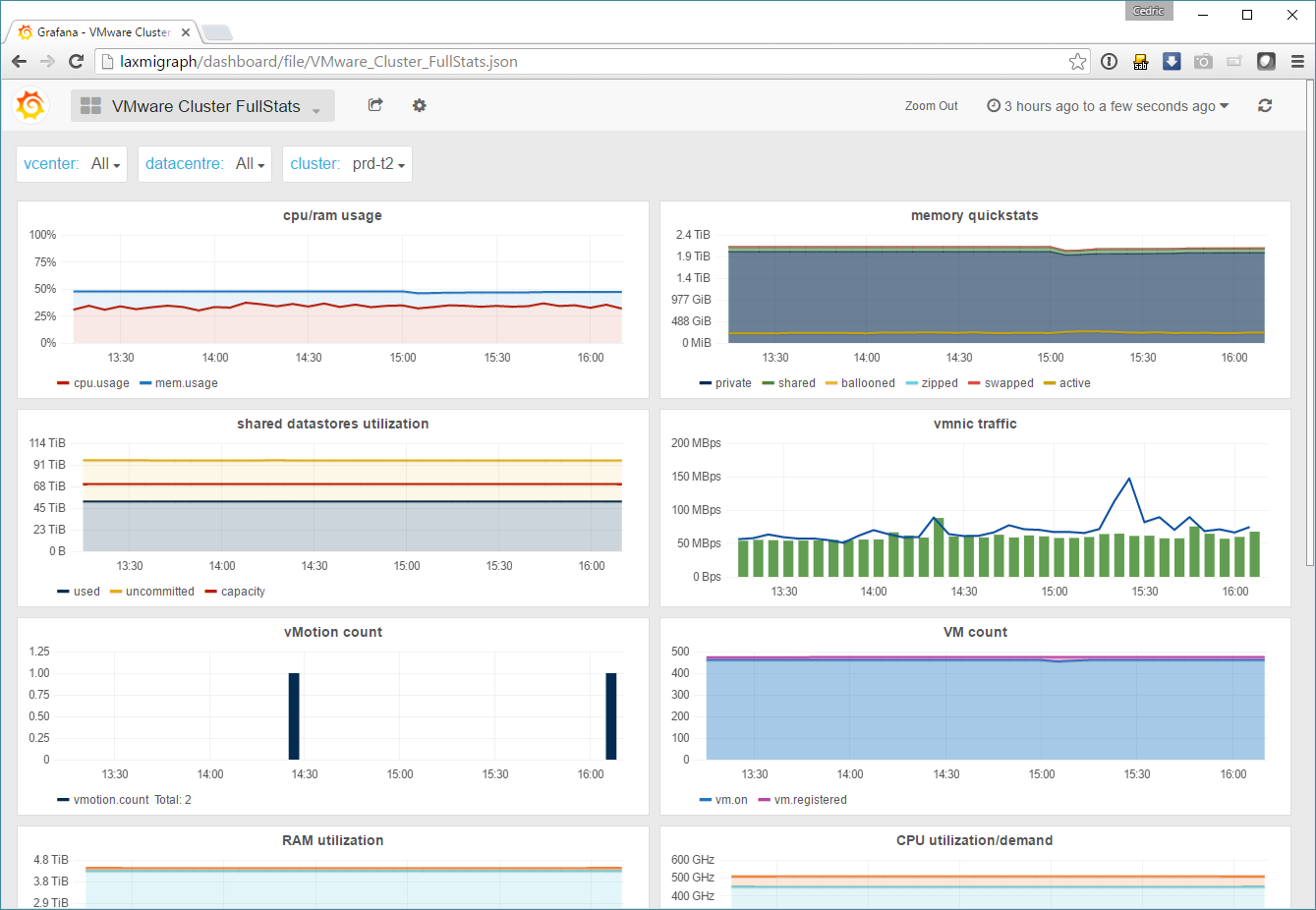 Dès que votre vCenter est enregistré et que les options de récolte sont activées (Virtual Infrastructure et/ou VSAN), SexiGraf va poller toutes les 5 minutes votre serveur et récolter l’ensemble des métriques dont il a besoin pour commencer à alimenter ses graphiques. Ensuite, et bien… vous prenez votre pot de popcorn et vous admirez (et analysez ^^) la consolidation réalisé. Je vous ai mis quelques copies d’écran ci-dessous pour vous faire une idée du potentiel de la solution, mais honnêtement, vu la simplicité d’installation et de mise en oeuvre, prenez 15/30 minutes pour l’installer directement en connectant votre vCenter !