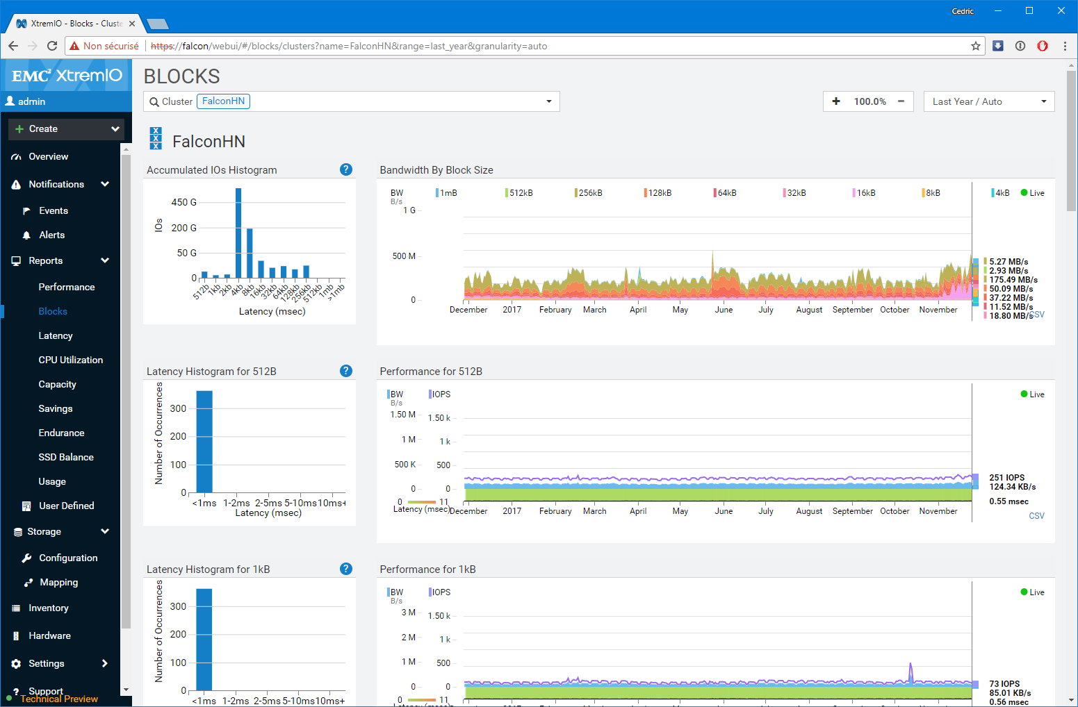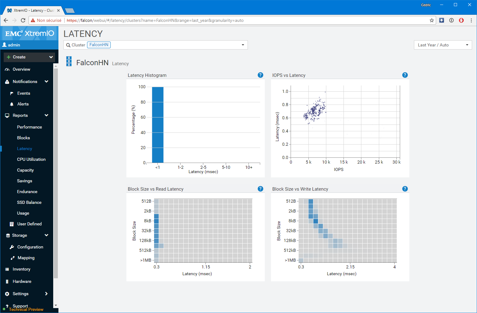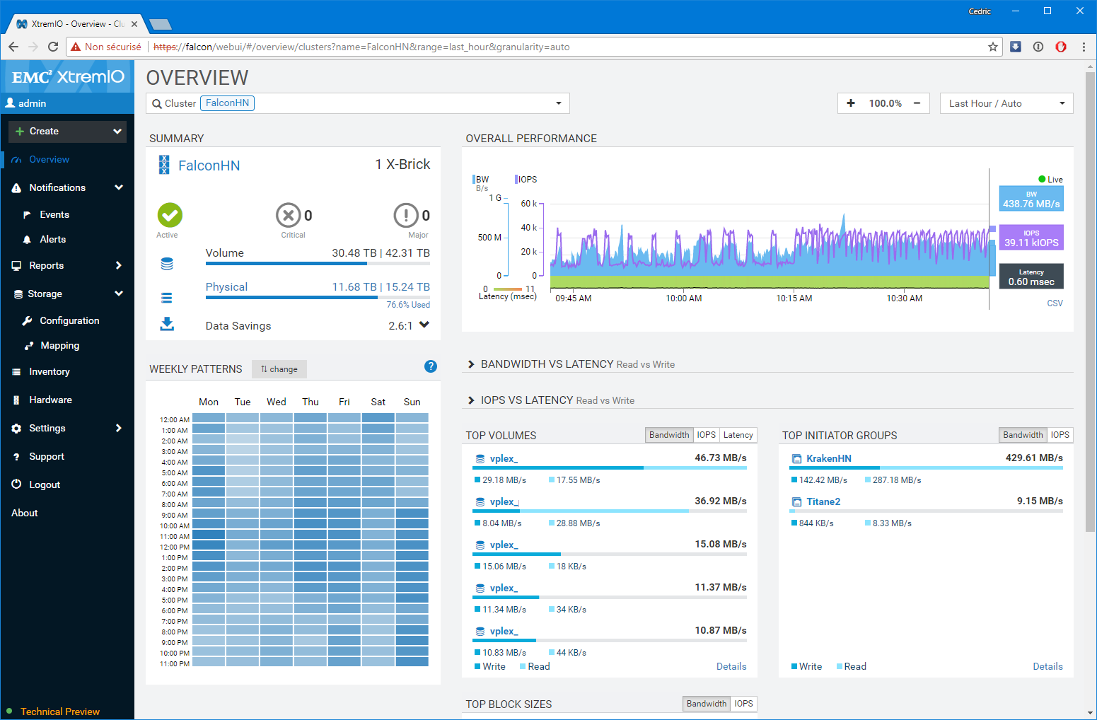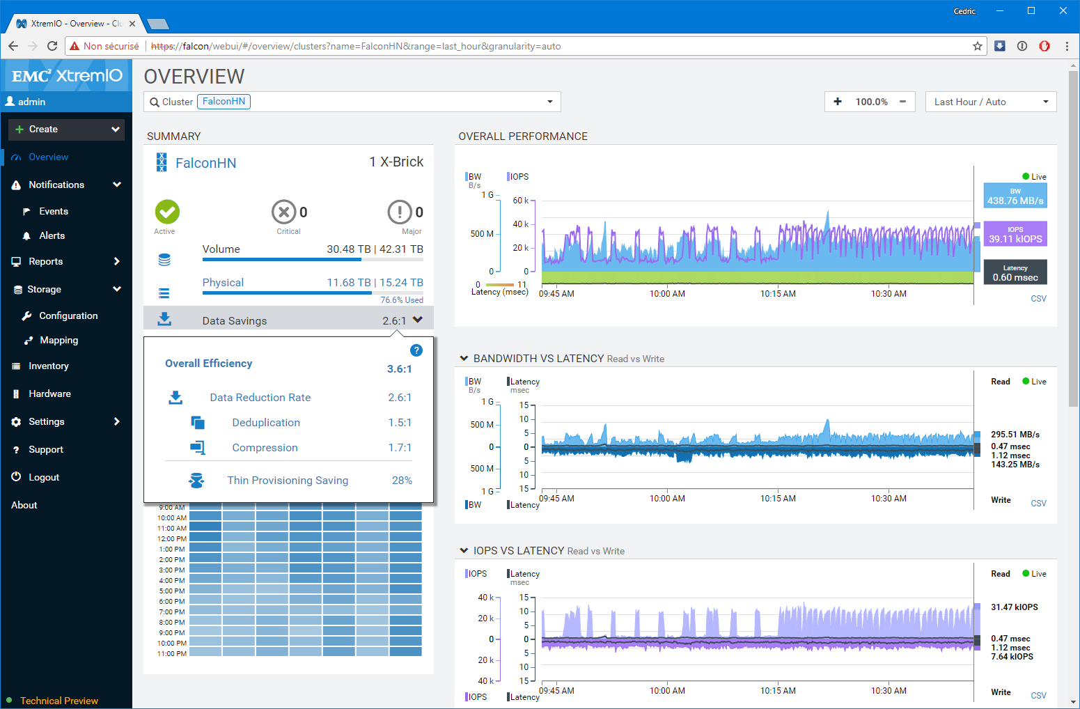 Premier bon point, les équipes de développement n’ont pas seulement réalisé un portage un-pour-un des fonctions disponibles sur l’applet Java, elles ont également grandement amélioré les fonctions de capacity planning et de monitoring (ce n’était pas un mal). Notamment, le dashboard de supervision sur lequel vous atterrissez est particulièrement bien pensé et s’adapte à la sélection réalisée. Par Défaut, l’interface présente l’ensemble des baies gérées par la XMS, mais si vous modifiez la sélection en vous focalisant sur l’une d’elles en particulier, le tableau de bord détail un peu plus le workload avec les LUNs les plus utilisées ou des graphes spécifiques de ratio IOps/Latence et BW/Latence bienvenus. D’une manière générale, c’est très ergonomique et pratique.